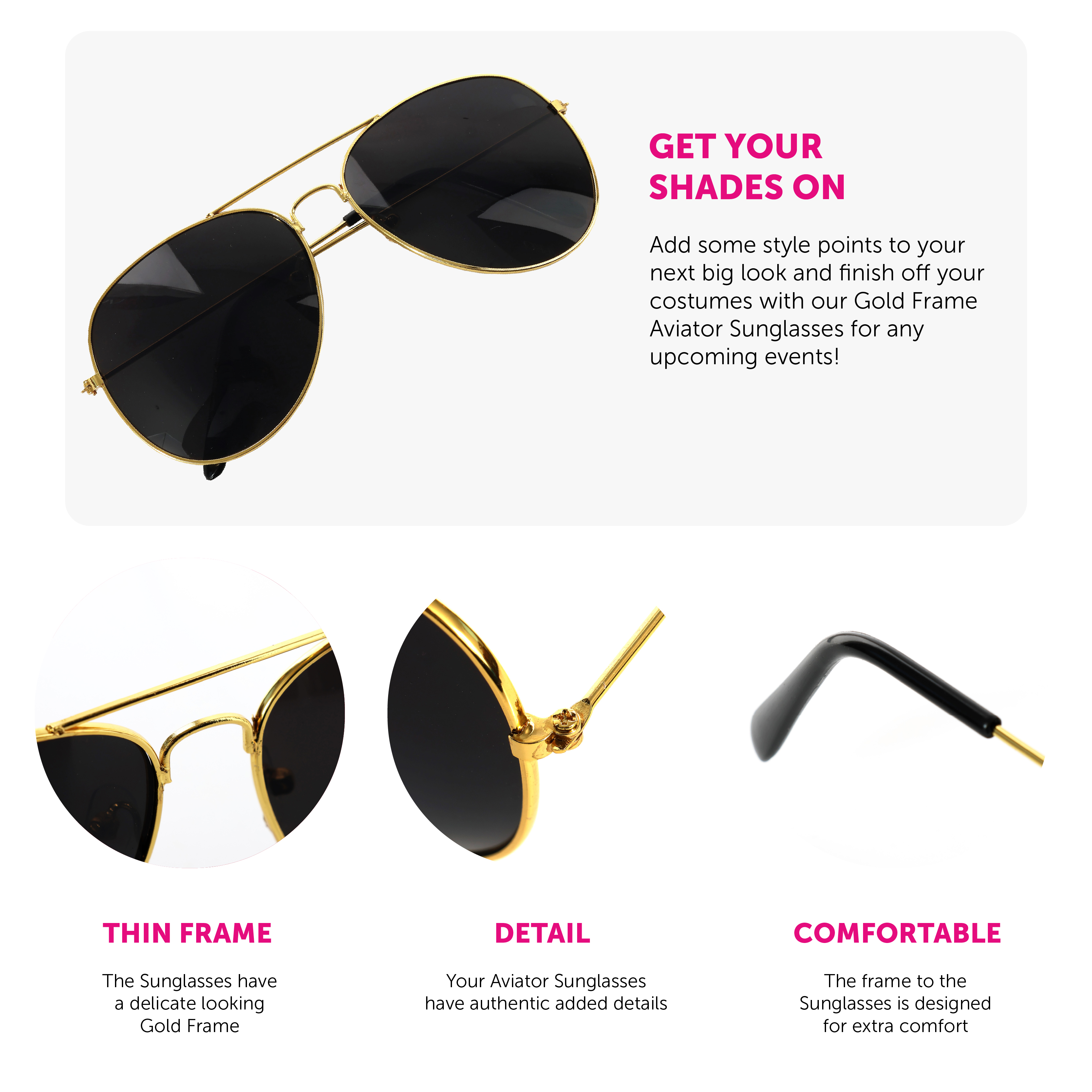 AVIATOR SUNGLASSES: Add some style points to your next big look and finish off your costumes with our Gold Frame Aviator Sunglasses for any upcoming events!