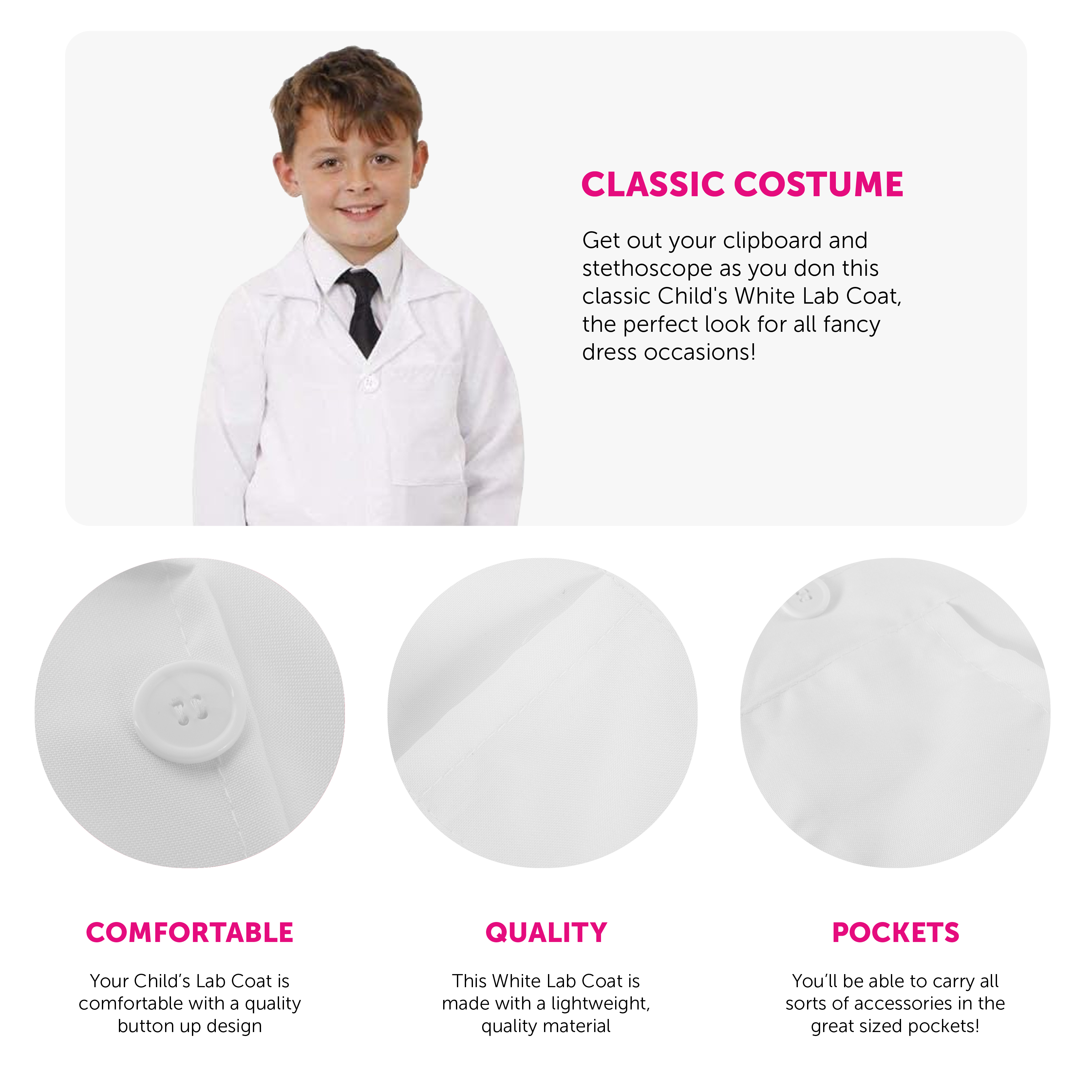 PERFECT FOR ANY FANCY DRESS EVENT: Whether you're dressing as Doctor, Nurse, Scientist, Chef or Dentist for any fancy dress occasion, this Childs White Lab Coat Costume is the perfect outfit