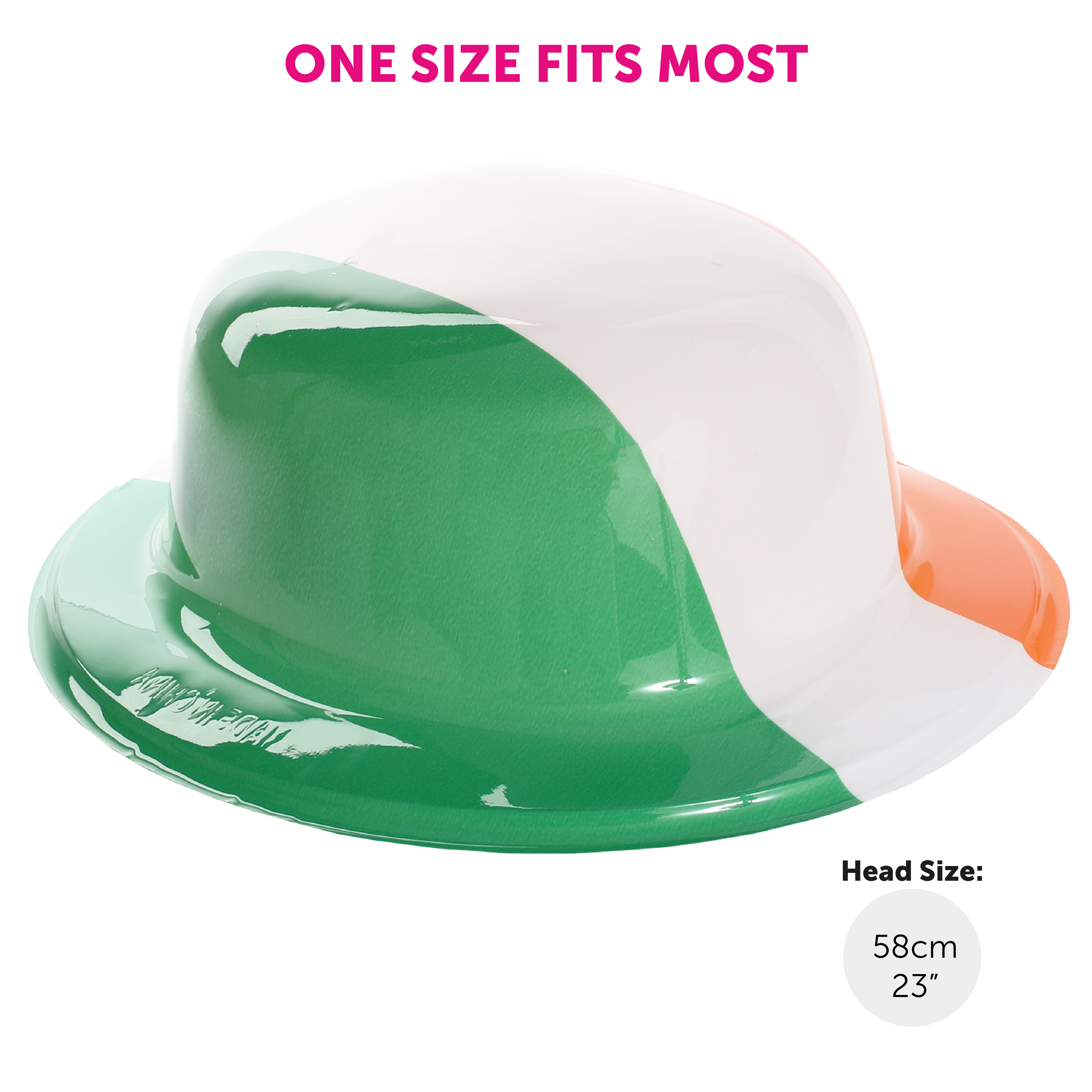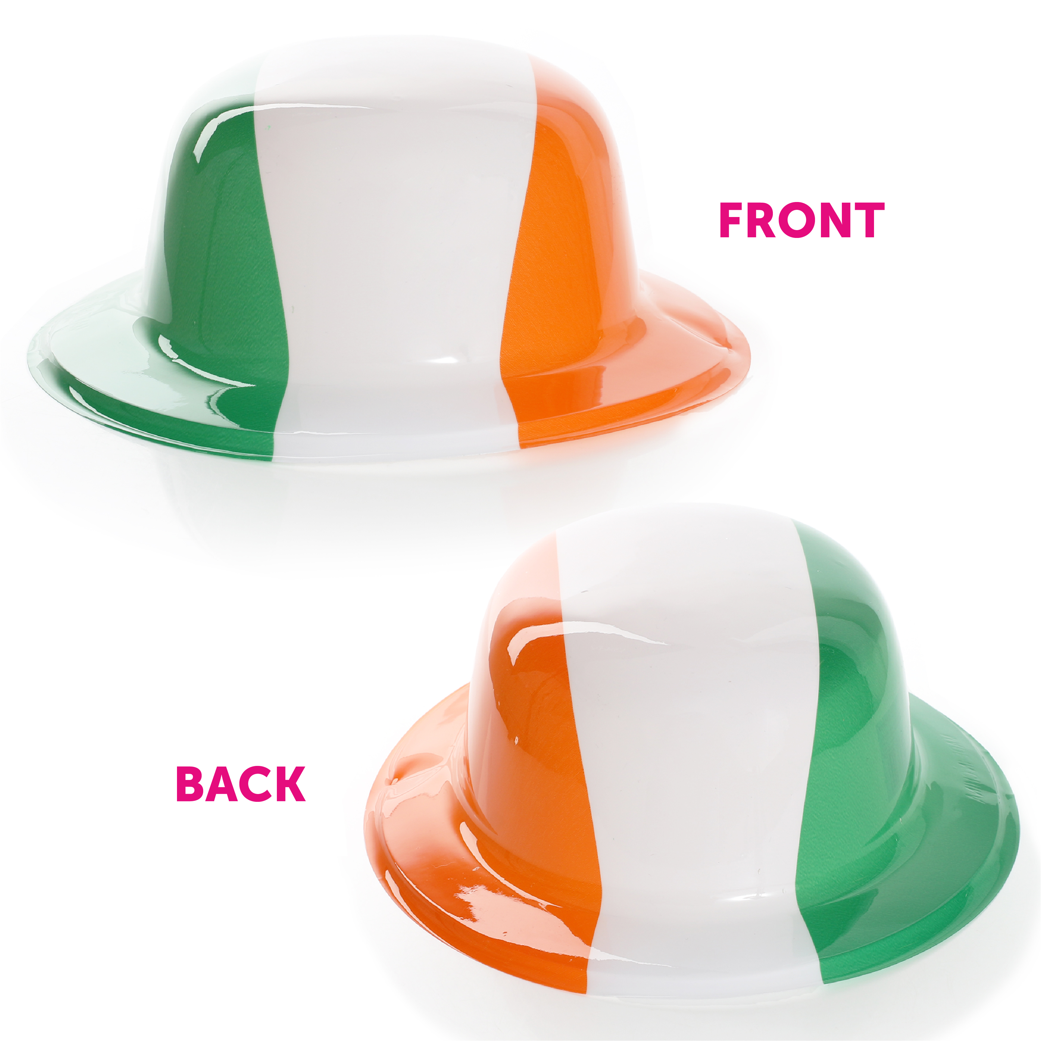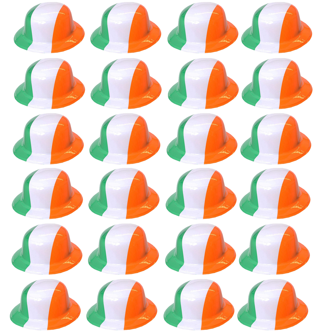 PACK OF 24 IRISH FLAG GREEN WHITE ORANGE STRIPED PLASTIC BOWLER HAT