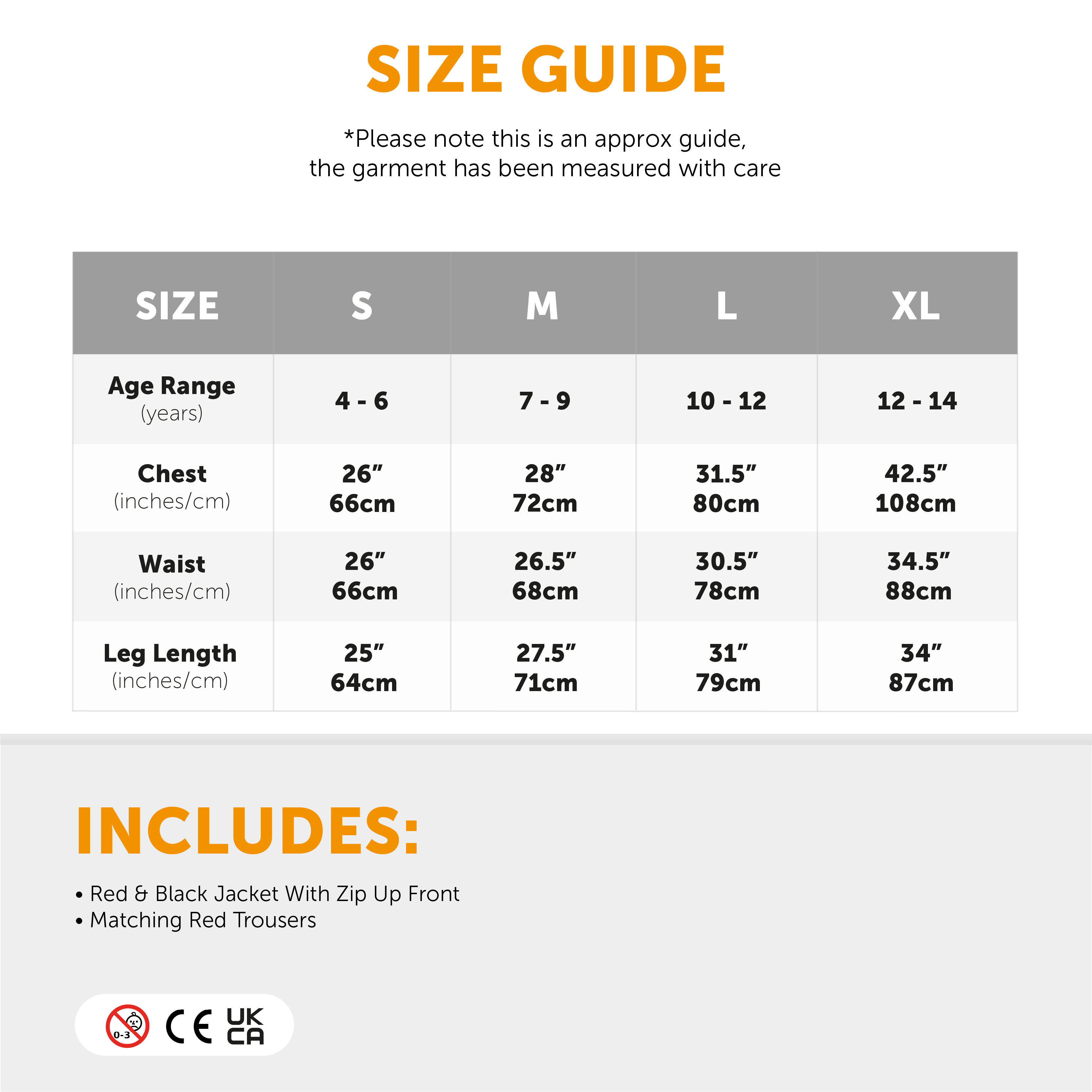 Small (4 - 6 years) Chest 26" (66cm), Waist 26" (66cm), Leg Length 25" (64cm)