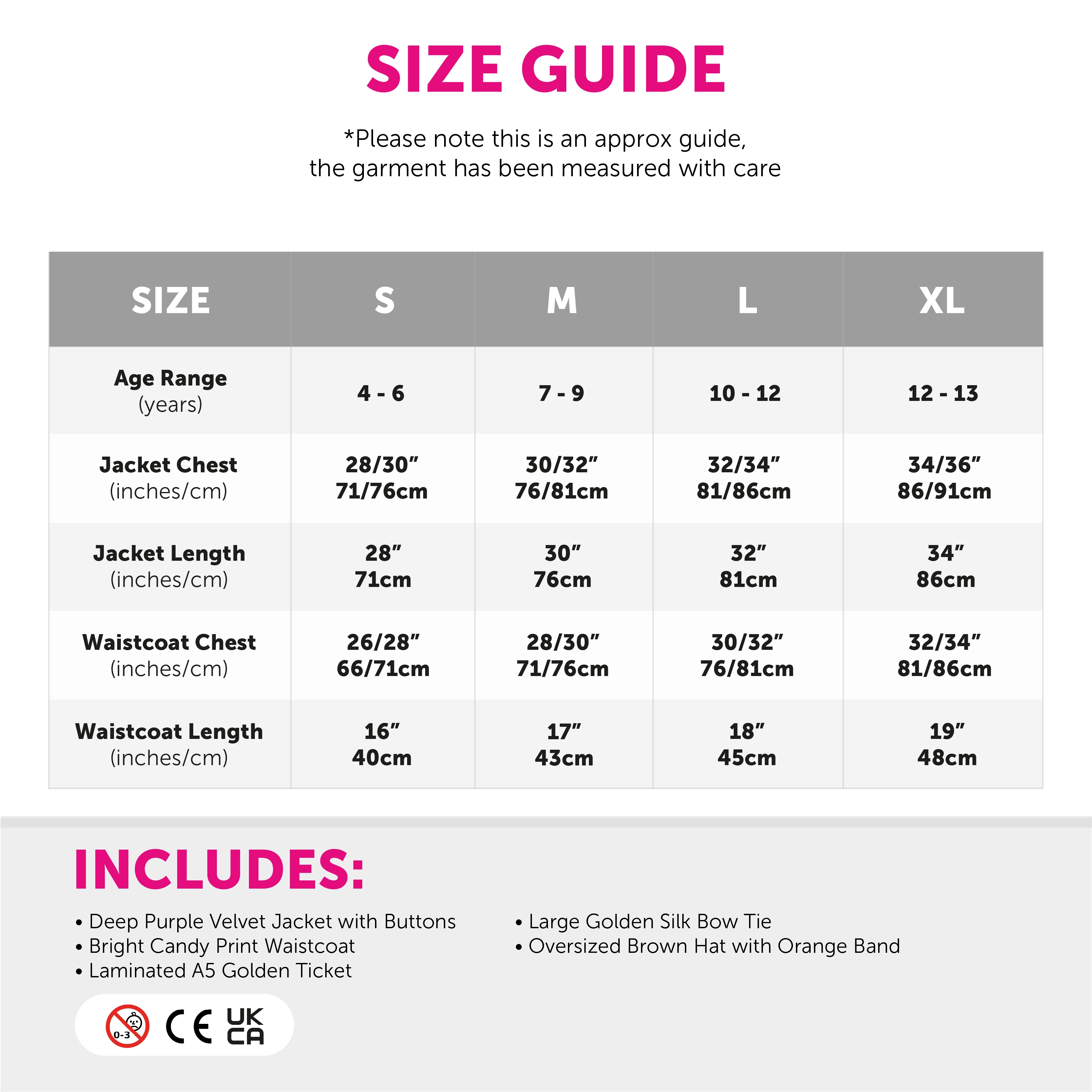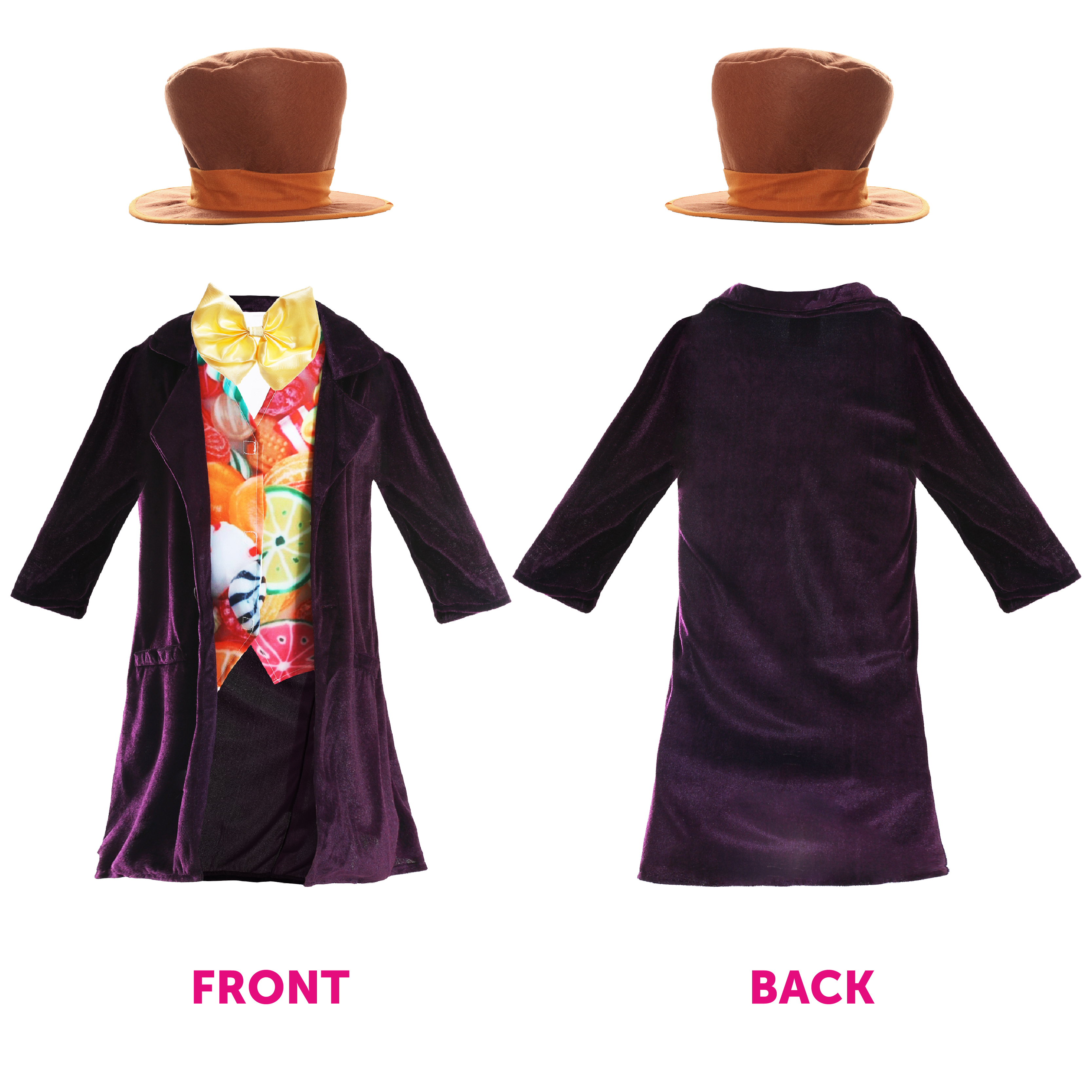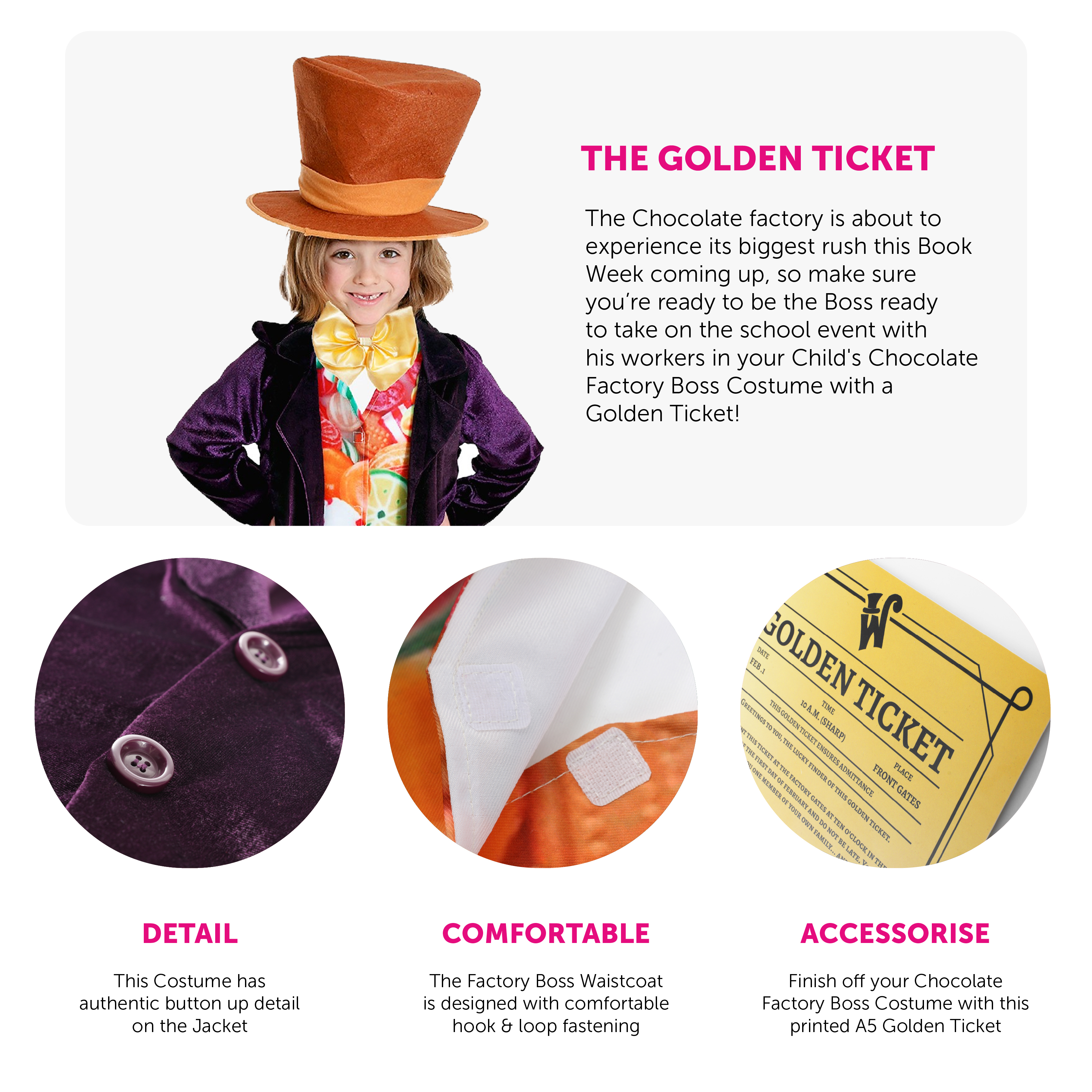 COSTUME INCLUDES: To be ready for the big day for Book Week, your Factory Boss costume includes Deep Purple Velvet Costume and Bright Candy Print Waistcoat with Buttons, a Large Silk Golden Bow Tie, and an Oversized Brown Hat with Orange Band
