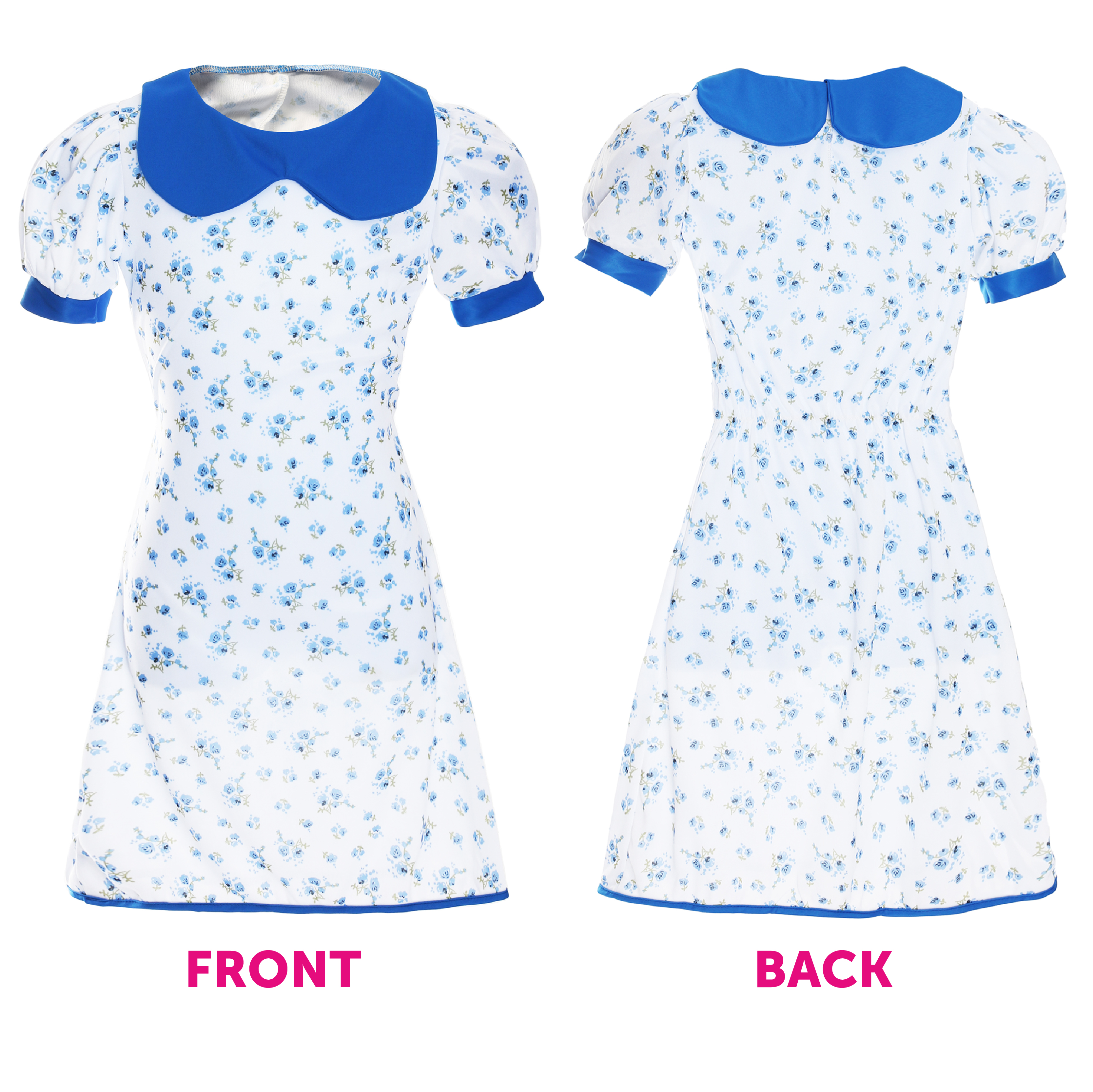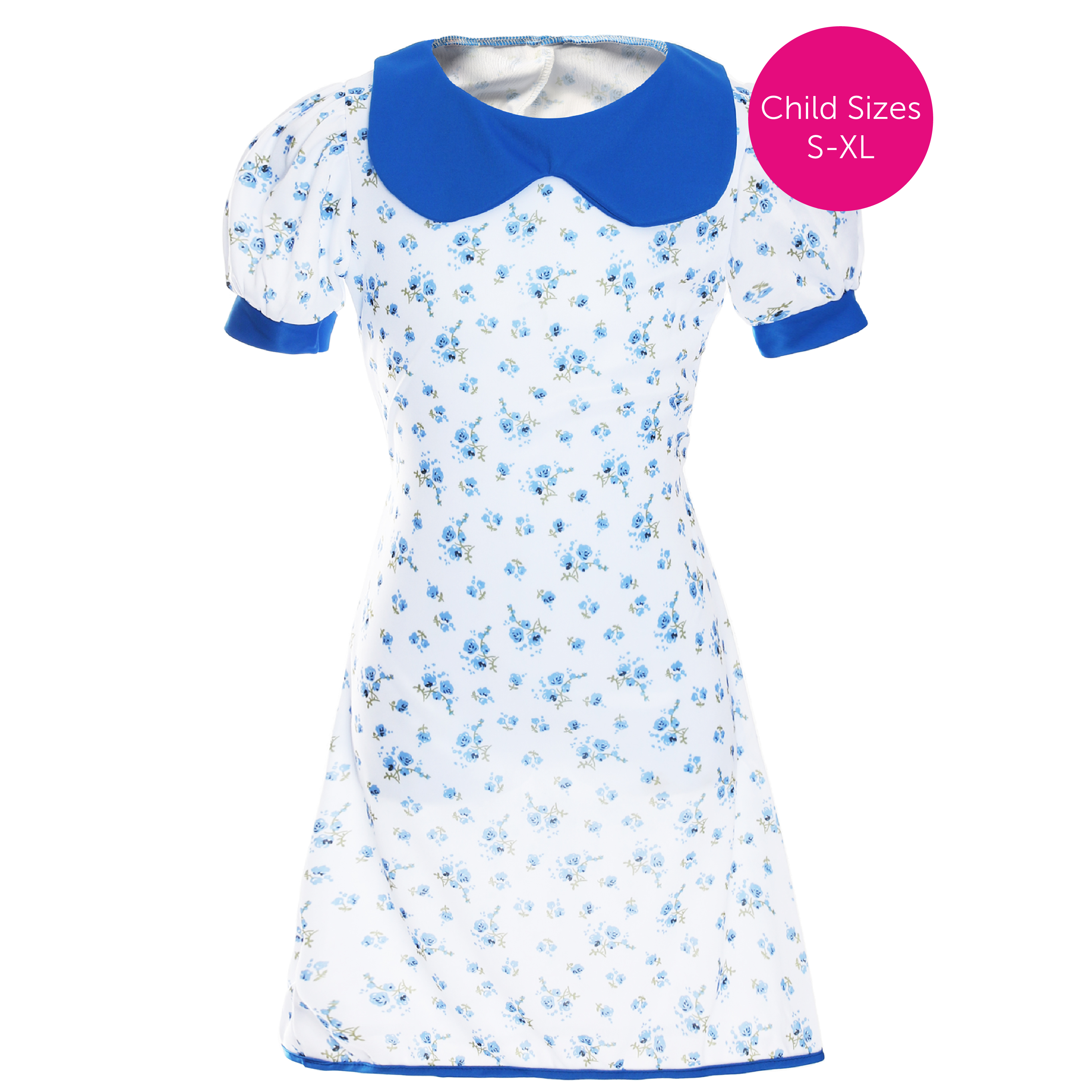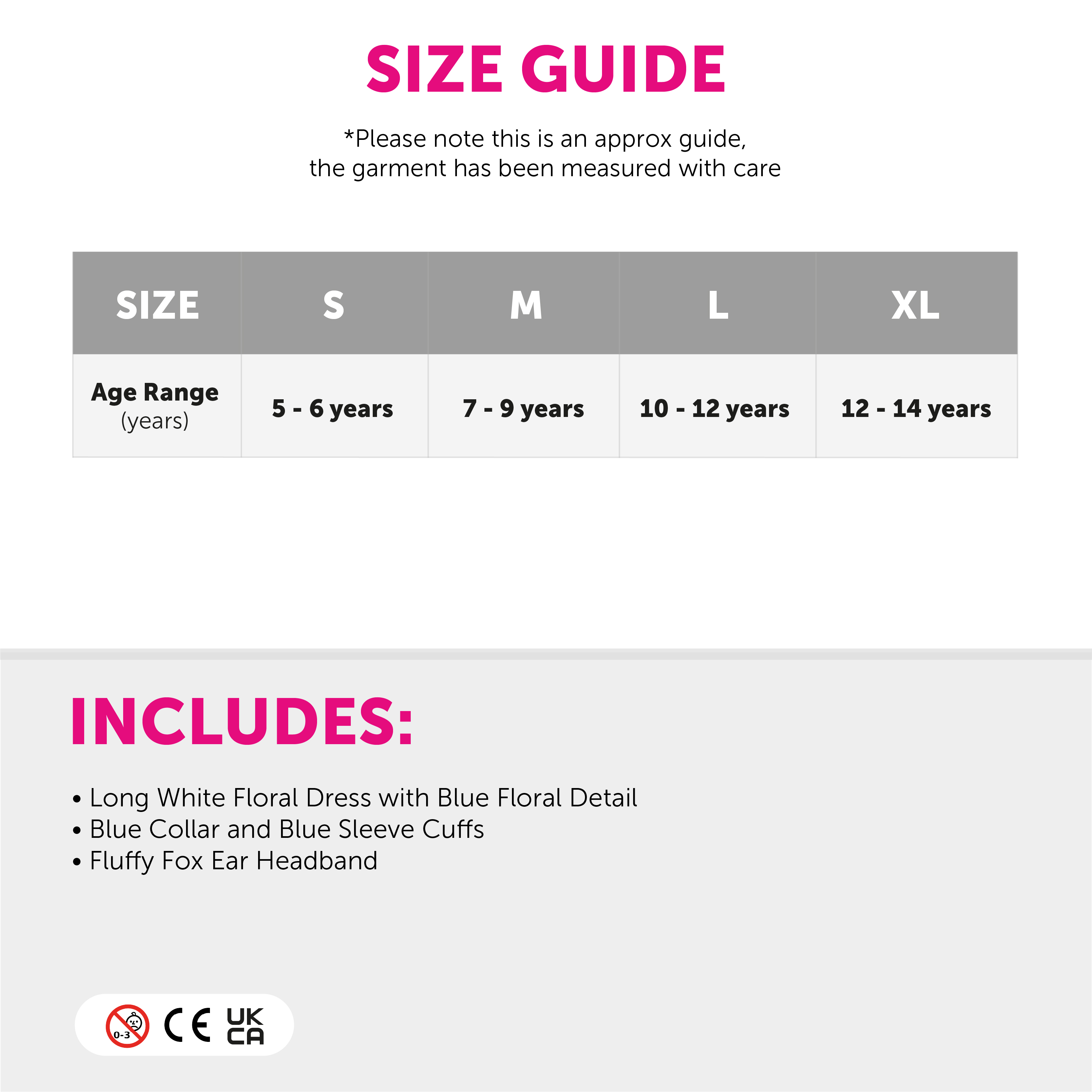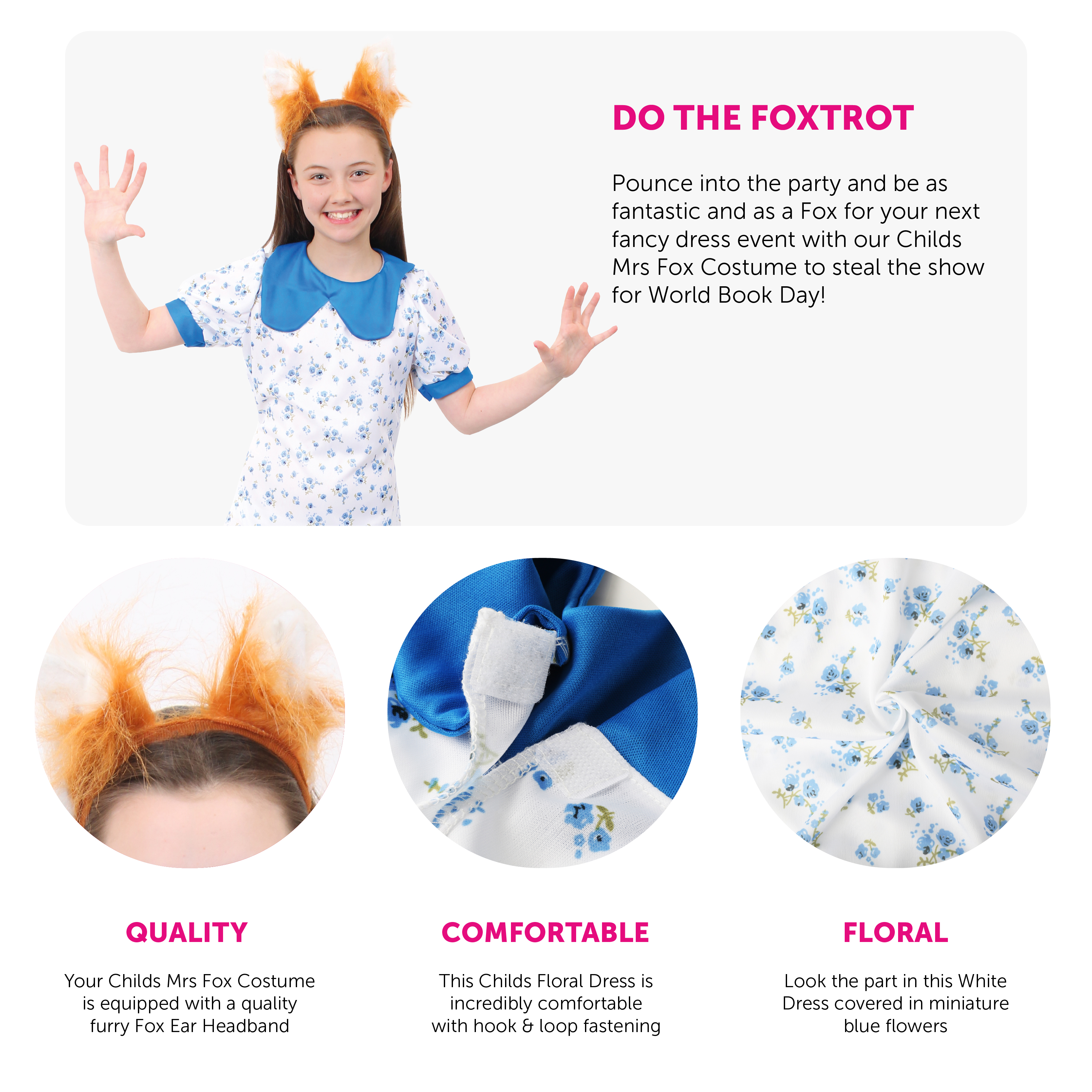 MRS FOX COSTUME DETAILS: Your Child’s Mrs Fox Costume includes a long White Floral Dress with Blue Flowers detail, a blue collar, blue-edged sleeves and a fluffy Fox Ear Headband!