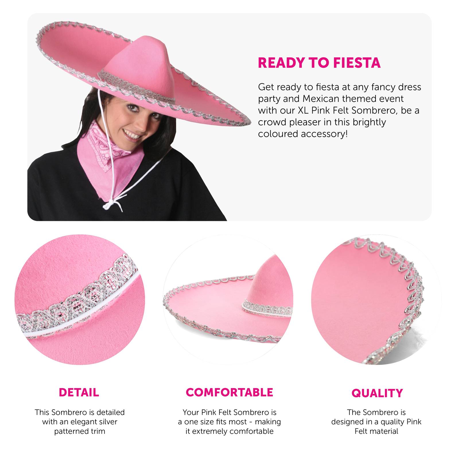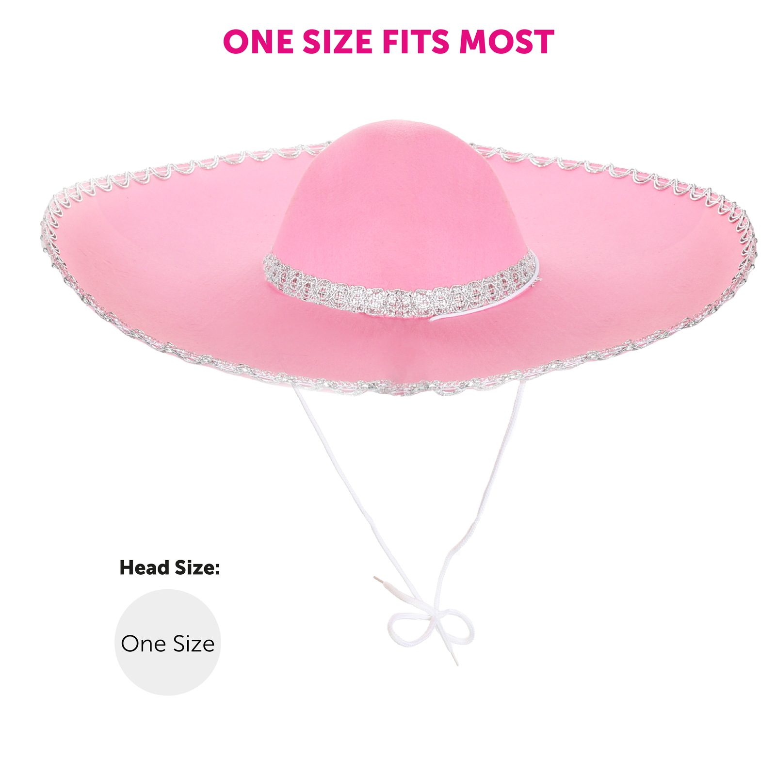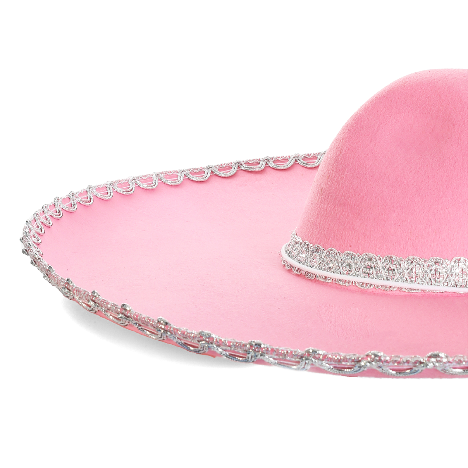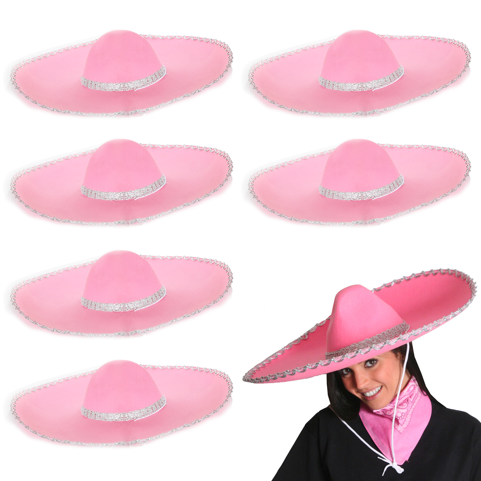 PACK OF 6 HUGE FELT SOMBRERO IN PINK WITH SILVER BRAIDING AROUND EDGE OF HAT
