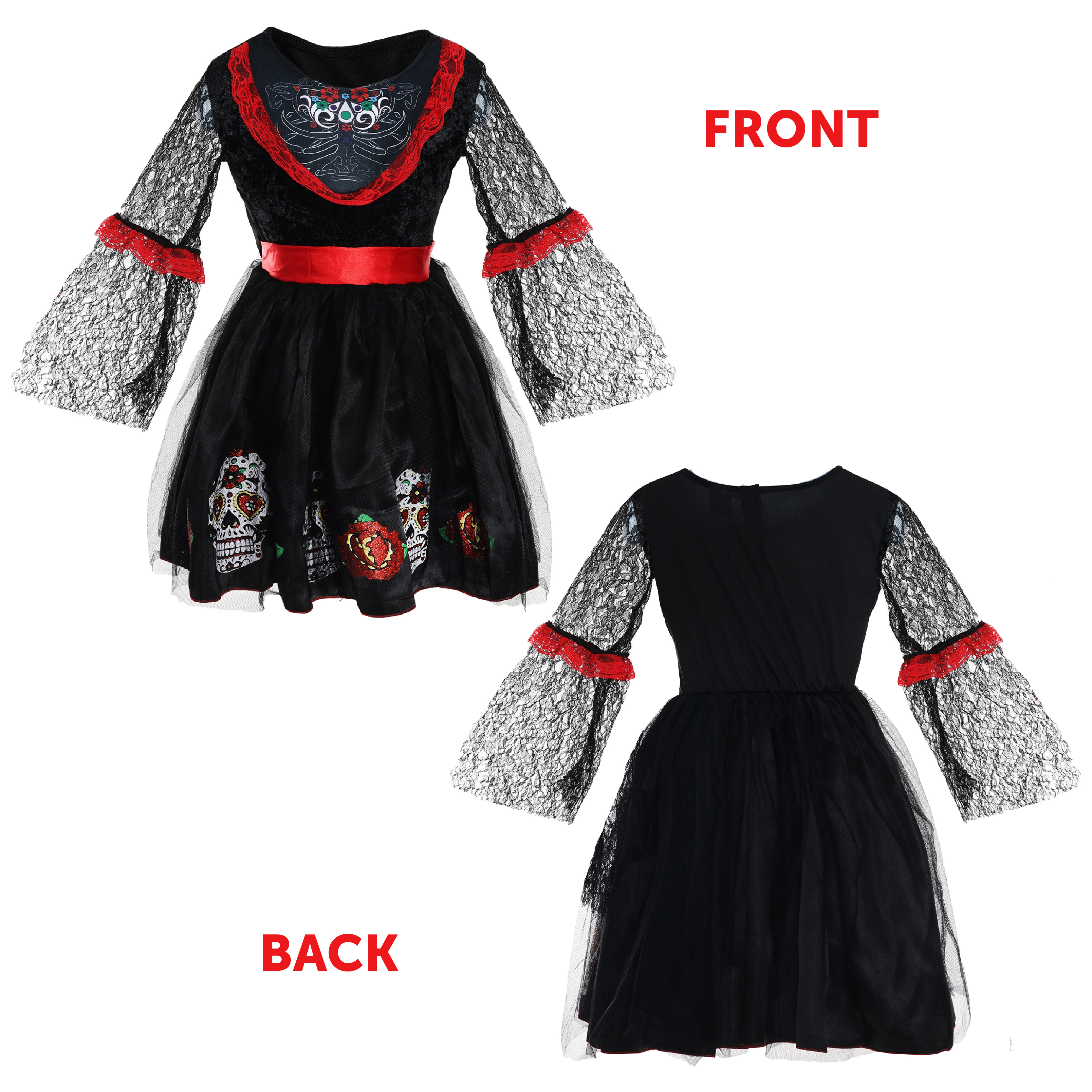 DRESS WITH LONG LACE SLEEVES, SKELETON PRINT ON CHEST