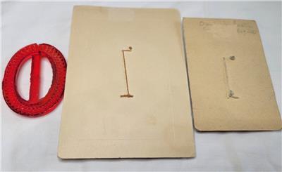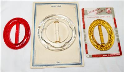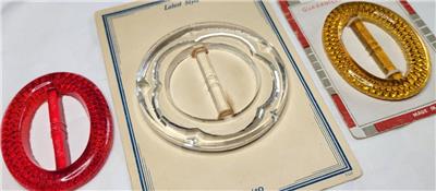 Lot of 3 vintage Czech glass belt buckles. All are the slide style. Buckles are clear, yellow and red. The clear and red buckles are both new on original cards. Red does appear used, has small flea bites along inside edge. Largest buckle measures 2 3/8" across. Buckles are in very good to new on card condition.