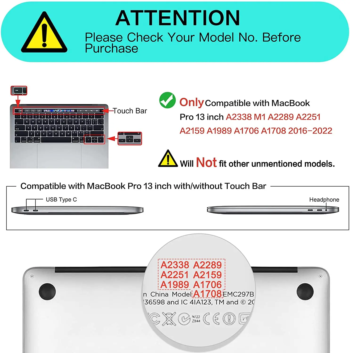 ONLY compatible with MacBook Pro 13 inch 2022-2016 (M2 M1 A2338 A2289 A2251 A2159 A1989 A1706 A1708 --MNEP3LL/A,MNEQ3LL/A,MNEH3LL/A,MNEJ3LL/A,MYD92LL/A,MYDC2LL/A,MYD82LL/A,MYDA2LL/A,MUHN2LL/A,MUHQ2LL/A,MUHP2LL/A,MUHR2LL/A,MV962LL/A,MV992LL/A,MV972LL/A,MV9A2LL/A,MR9Q2LL/A,MR9R2LL/A,MPXV2LL/A,MPXX2LL/A,MPXW2LL/A,MPXY2LL/A,MPXQ2LL/A,MPXR2LL/A,MPXT2LL/A,MPXU2LL/A,MLL42LL/A,MLH12LL/A,MLVP2LL/A,MNQF2LL/A,MNQG2LL/A,MXK32LL/A,MXK62LL/A,MXK52LL/A,MXK72LL/A,MWP42LL/A,MWP72LL/A,MWP52LL/A,MWP82LL/A).