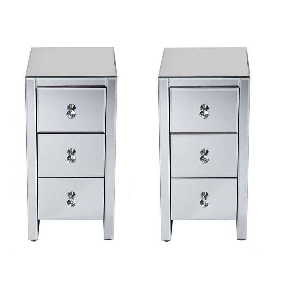 Dieser Nachttisch aus verspiegeltem Glas mit drei Schubladen wird Ihrem Schlafzimmer mit Sicherheit Glanz verleihen. Dieser funkelnde Nachtschrank wird Ihrem Boudoir einen eleganten Stil mit einem modernen Twist verleihen. Drei geräumige Schubladen säumen die Vorderseite mit jeweils schönen Kristallknöpfen. Dieser Nachttisch aus Spiegelglas mit drei Schubladen besteht aus hochwertigem MDF und Glas, das umweltfreundlich und langlebig im Gebrauch ist. Es sorgt zudem für einen dezenten Look und macht die Schubladen zugänglich. Die verspiegelte Oberfläche fängt das Licht schön ein und schafft einen glamourösen, funkelnden Look in Ihrem Schlafzimmer.