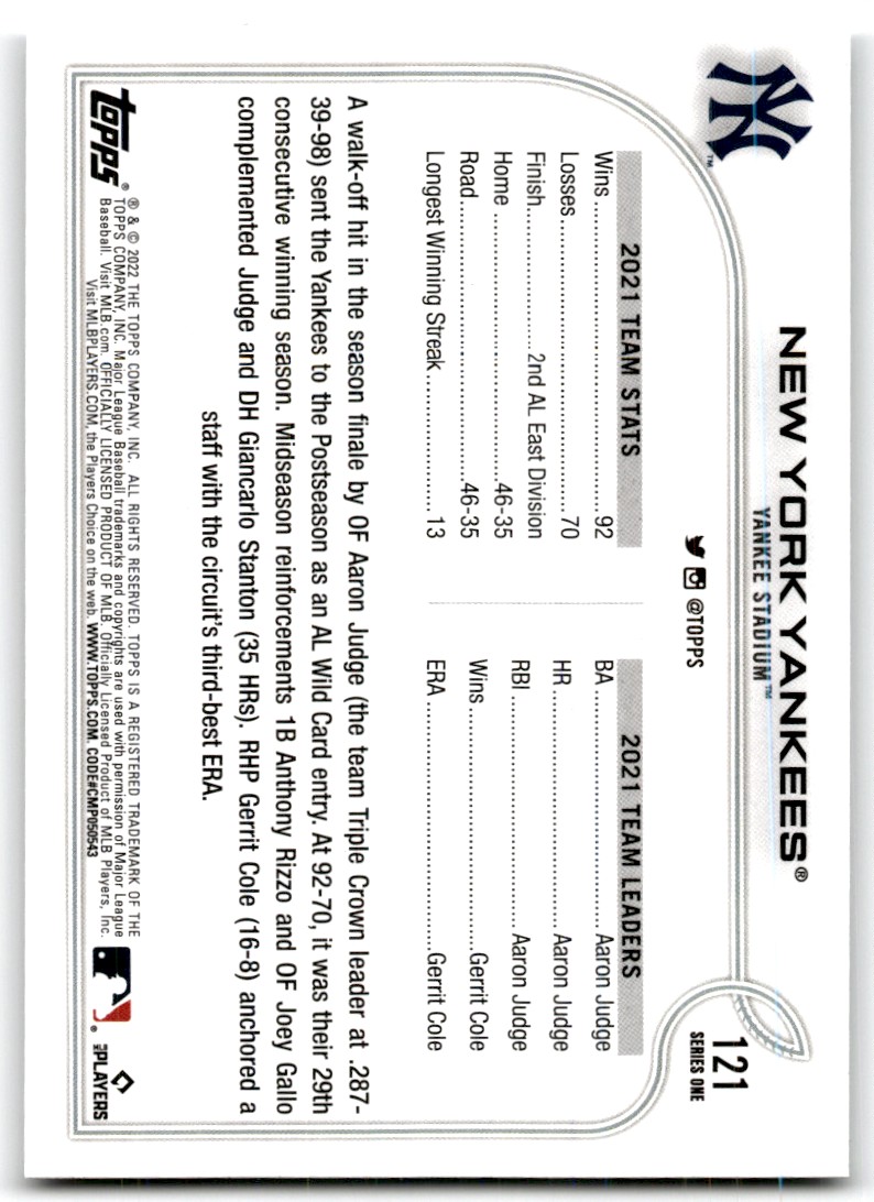 2022 Topps 121 New York Yankees