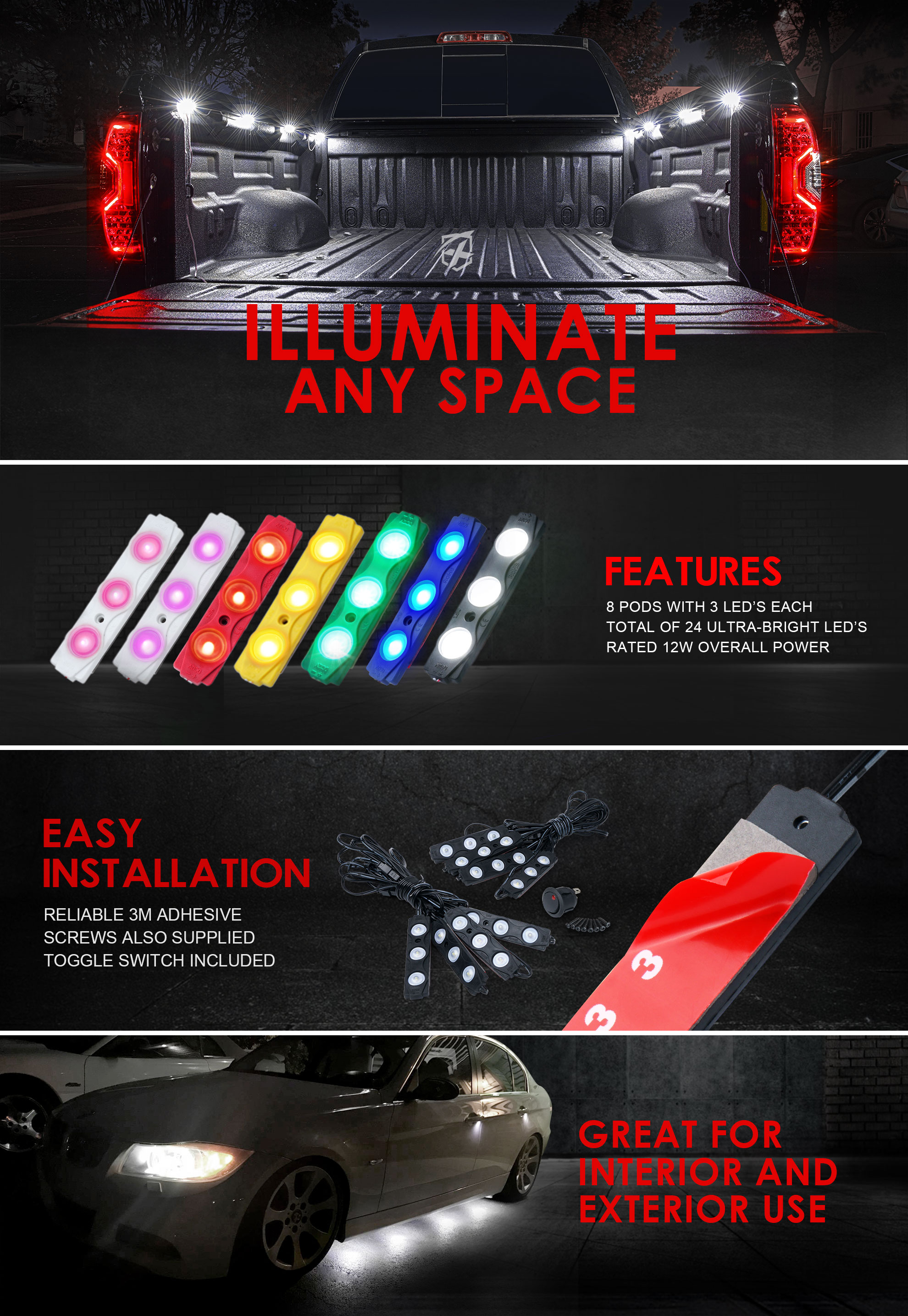 1)Our 8 Piece LED Lighting Kit will illuminate any space with a flip of a switch, Perfect for brightening up the engine bay or the ground underneath. Also great for interior foot wells, truck bed lighting, and many other applications to catch the eye of spectators.
