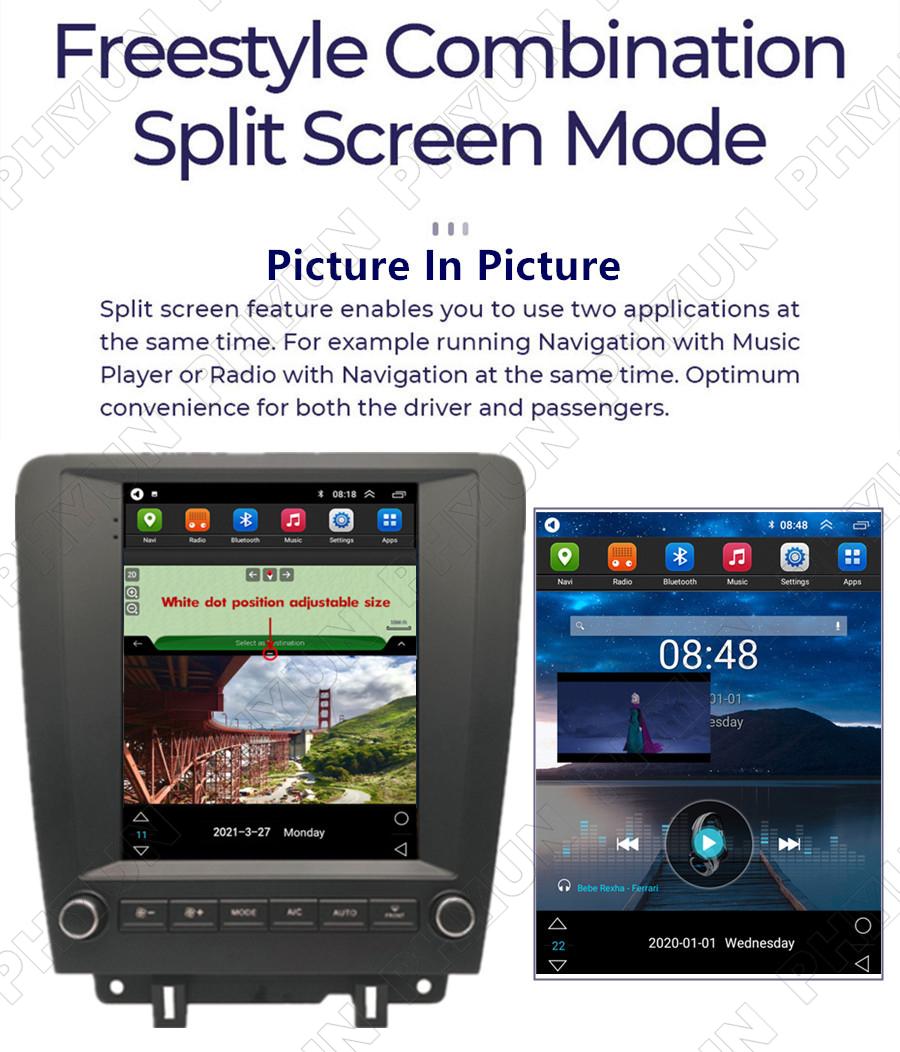 Display | - Touch Screen: Yes - Resolution: 1024*768 - Capacitive or Resistance Screen: Capacitive - Built-in Clock and Calendar: Yes, show real time and can use network-provided time- Main Menu Status Bar display: Can be changed to Music/Radio/BT-Stereo Player and Clock/Date/Week - Change Apps-Icon Position: Yes - Spilt Screen: Yes Split screen feature enables you to use two applications at the same time. For example running Navigation with Music Player or Radio with Navigation at the same time. Optimum convenience for both the driver and passengers. - Picture in picture split screen:Yes |