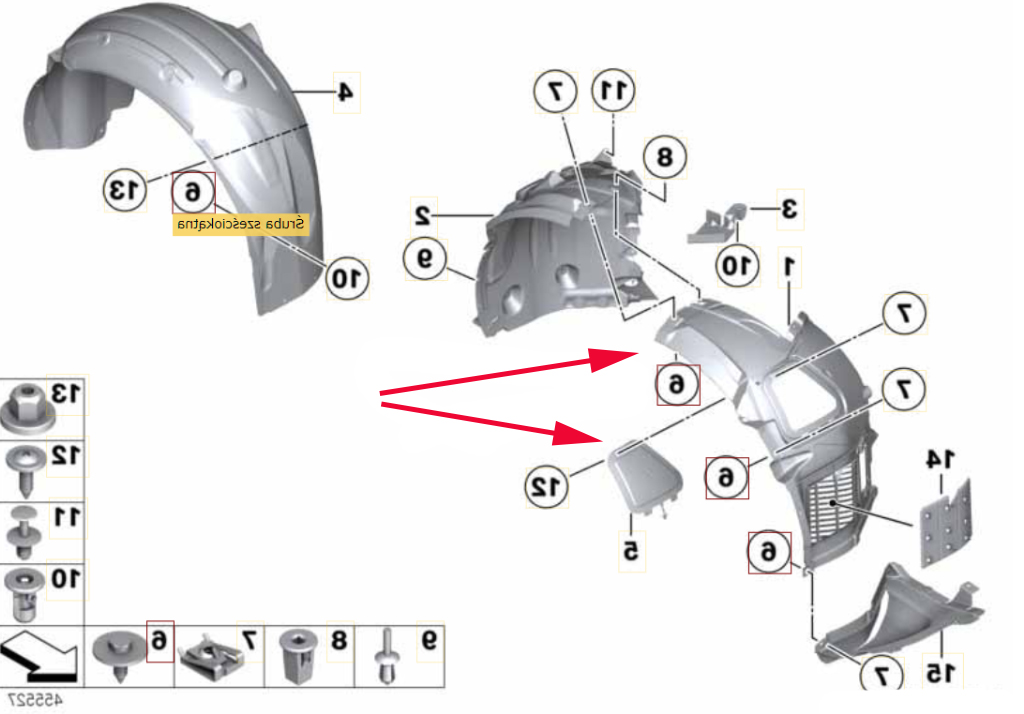 Bei diesem Modell besteht der Innenkotflügel aus drei Teilen. Der Teil, den Sie erhalten, ist in der Abbildung mit einem roten Pfeil gekennzeichnet.