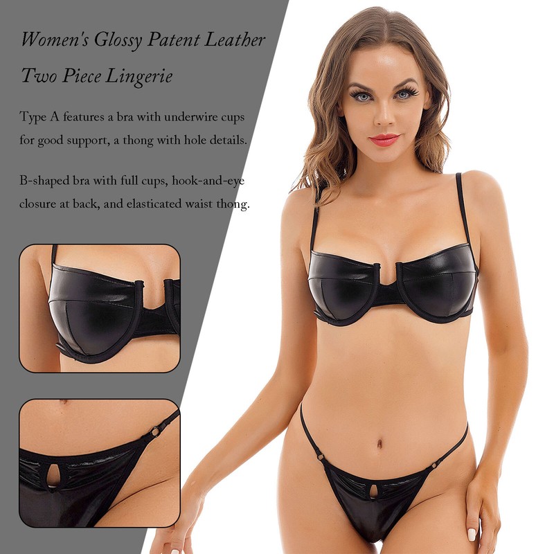 Womens Two-piece Lingerie Suit Glossy Patent Leather Underwear Set Clubwear Valentines Gift.