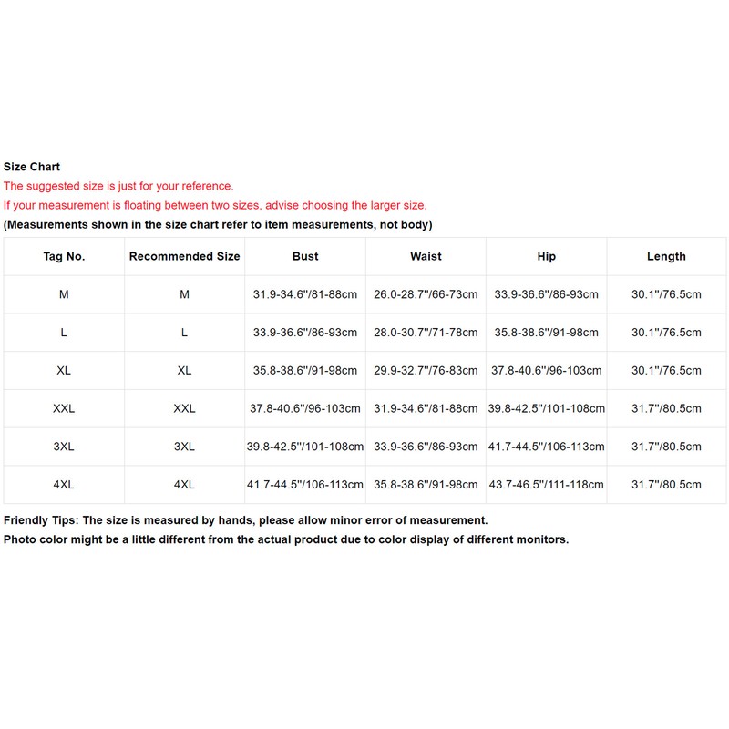 | Tag No. | Recommended Size | Bust | Waist | Hip | Length |