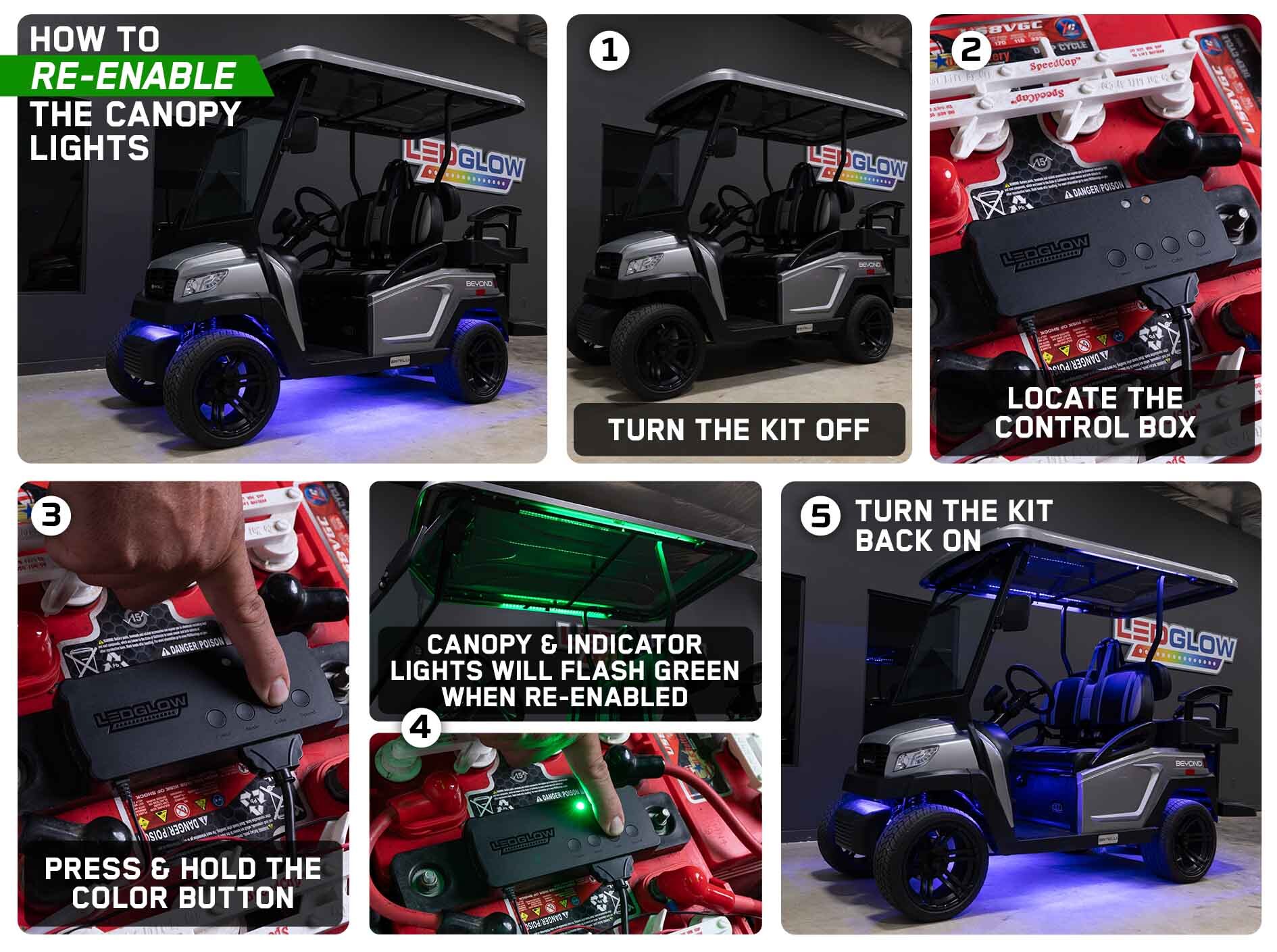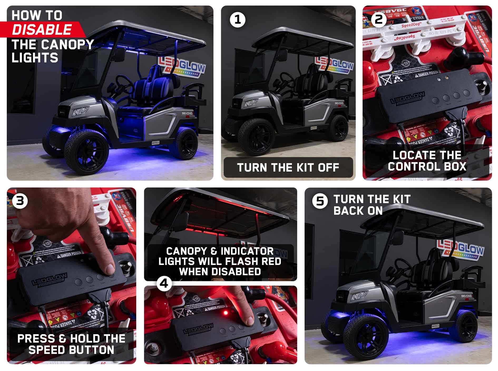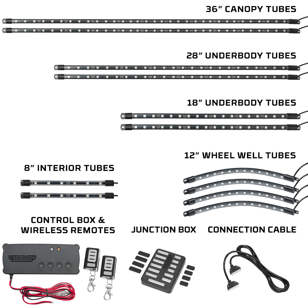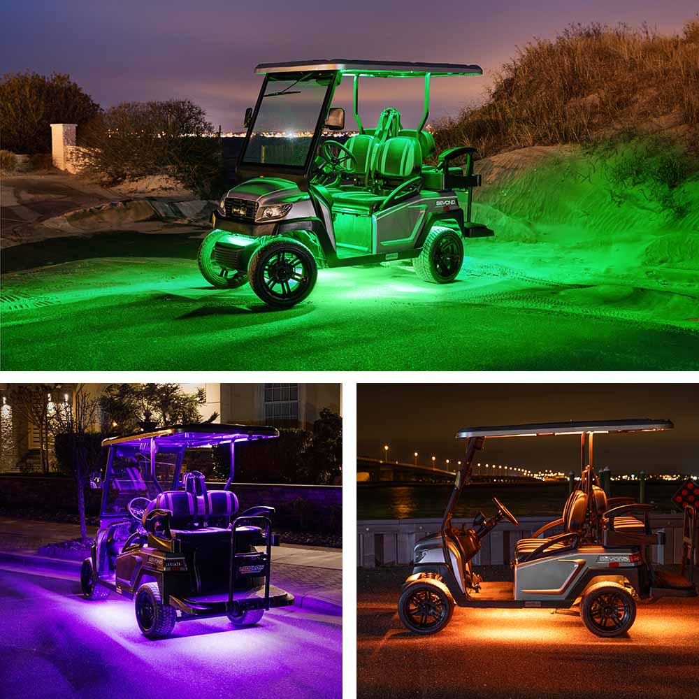 LEDGlow 12pc Electronic Million Color LED 4 Seater Golf Cart Lights combine multiple colors and lighting effects to create custom patterns for your EZGO, Yamaha, Club Car and other models. This electric golf cart light kit comes with (2) 28 and (2) 18 Underglow Tubes, (2) 36 Canopy Tubes, (2) 8 Interior Tubes and (4) 12 Wheel Well Tubes packed with ultra-bright wide-angle 5050 SMD LEDs. These golf cart LED lights have a Built-In Voltage Reducer and work with electric golf carts that have a 12v, 36v, 36v and 72v battery.