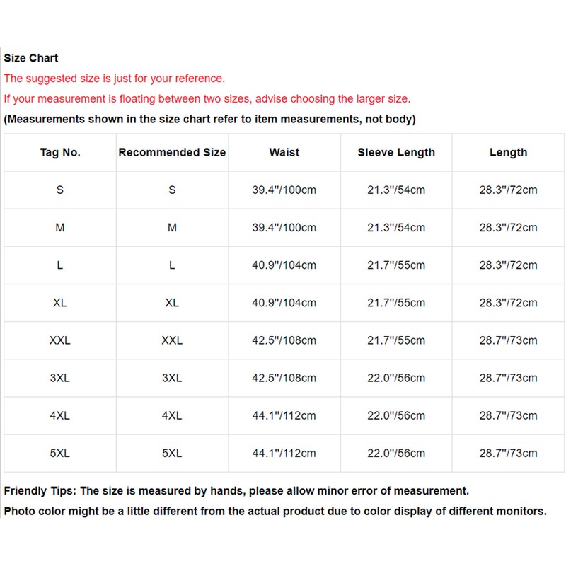 | Tag No. | Recommended Size | Waist | Sleeve Length | Length |