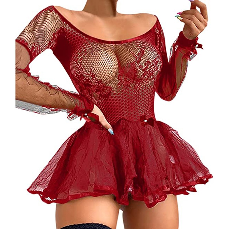 Women’s one-piece erotic hollow out fishnet bodystockings lingerie mini dress, one size fits most.
