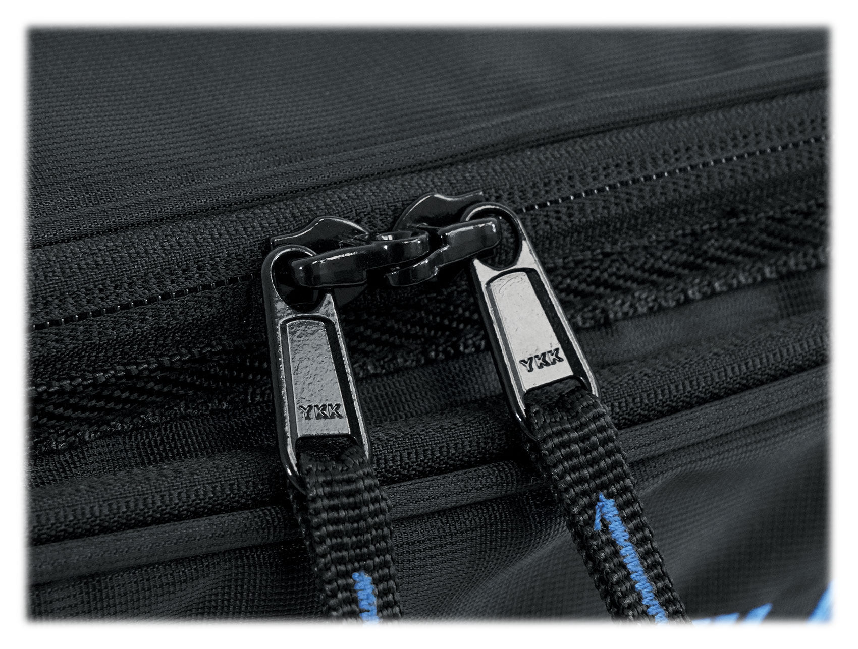 This bag is built tough and has thoughtful features and touches throughout. We use top of the line zippers that are road-tough. When you close the zippers there is a little flap that covers most of the the zipper track which helps keep water out but also it is oddly satisfying because it looks so clean when you close the zipper. We also added the ability to add a pad-lock between the dual zippers (lock not included).