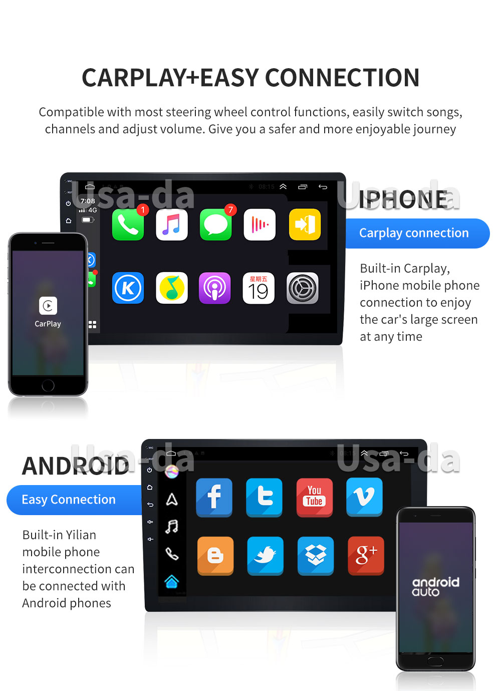 · Support Mirror Link function: Yes, support screen mirroring from iPhone and android smartphone