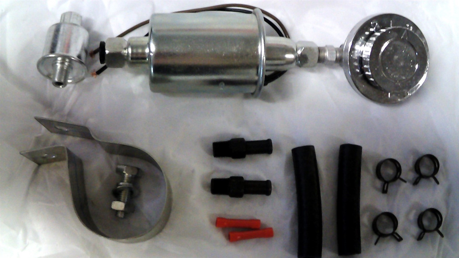This in-line 6 volt eletric pump will deliver one to five PSI adjusted by a dial. Comes with 1/8" pipe fittings, and 2 nipples to connect the common 5/16 gas hose. Can be used on positive ground systems, as there is separate connections for both positive and negative.