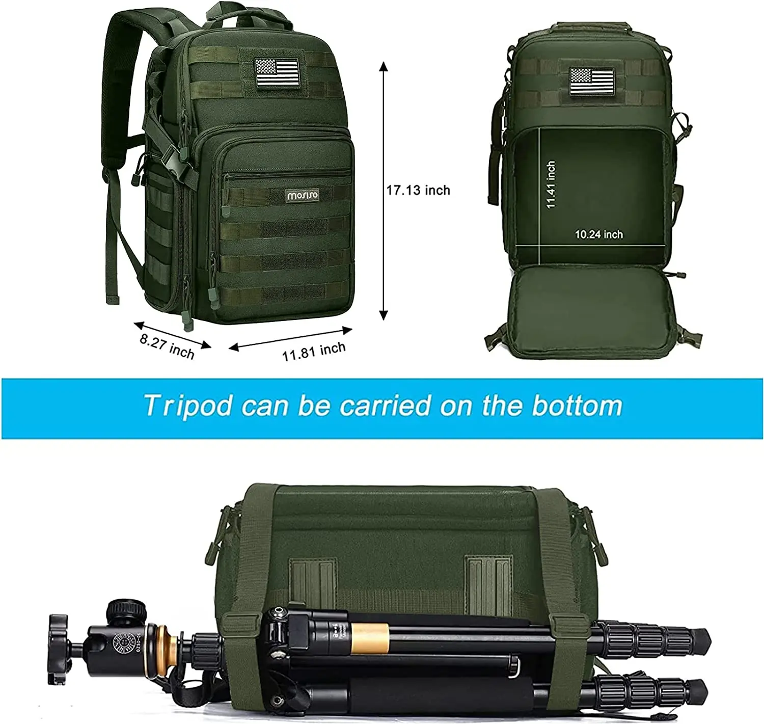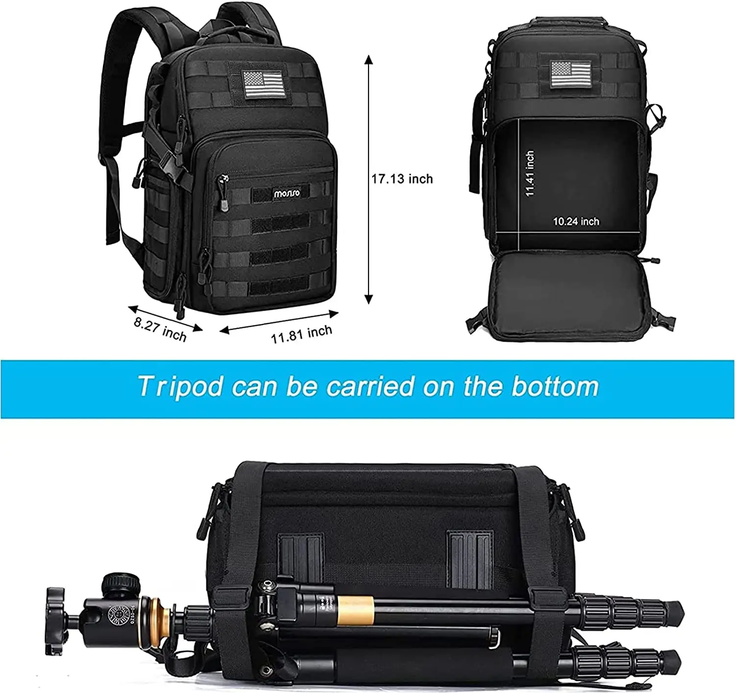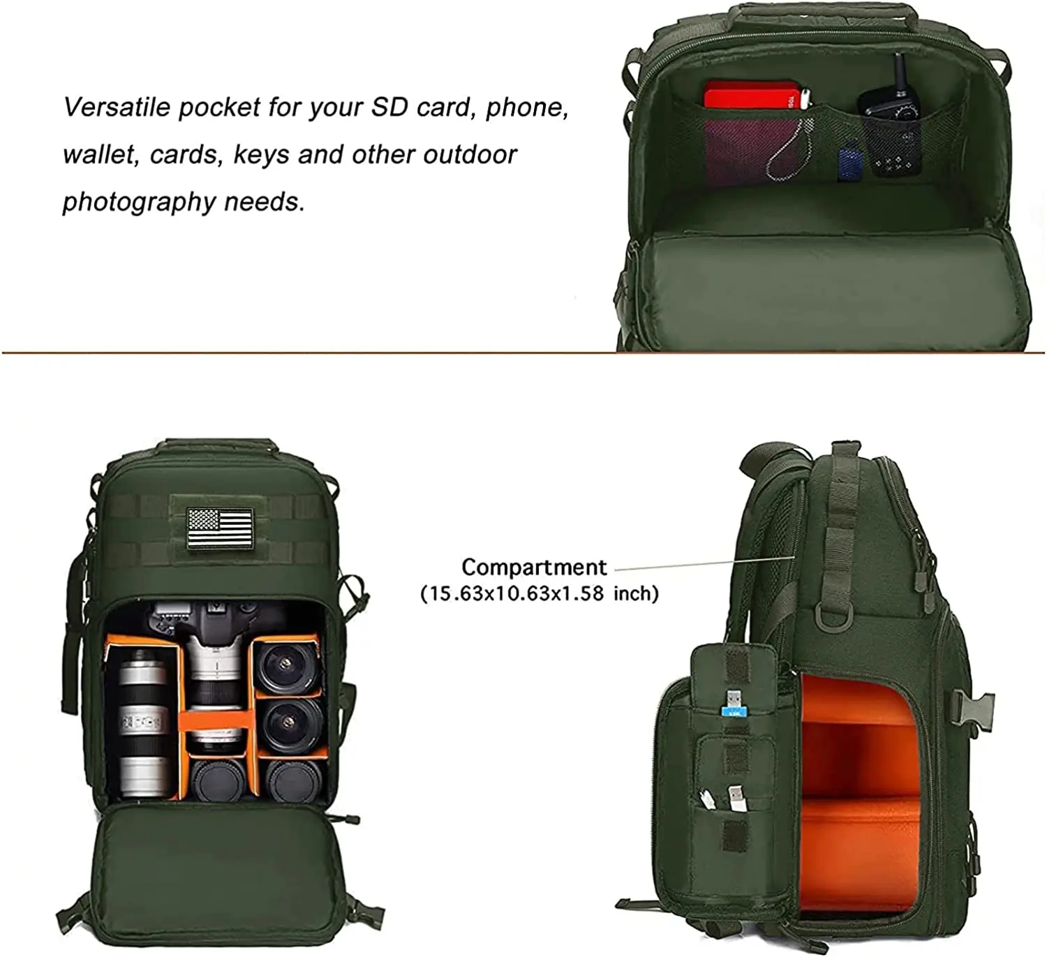This tactical camera backpack daypack is made of durable polyester material. A removable USA flag patch in front and webbing throughout whole bag can attach additional pouch or outdoor gear. Inner foam padded layer can provide good buffer and protection to your internal stuff against scratches, impact, shock and drops. Reinforcement edge & bottom with side load compression system, perfectly used in wild environment.