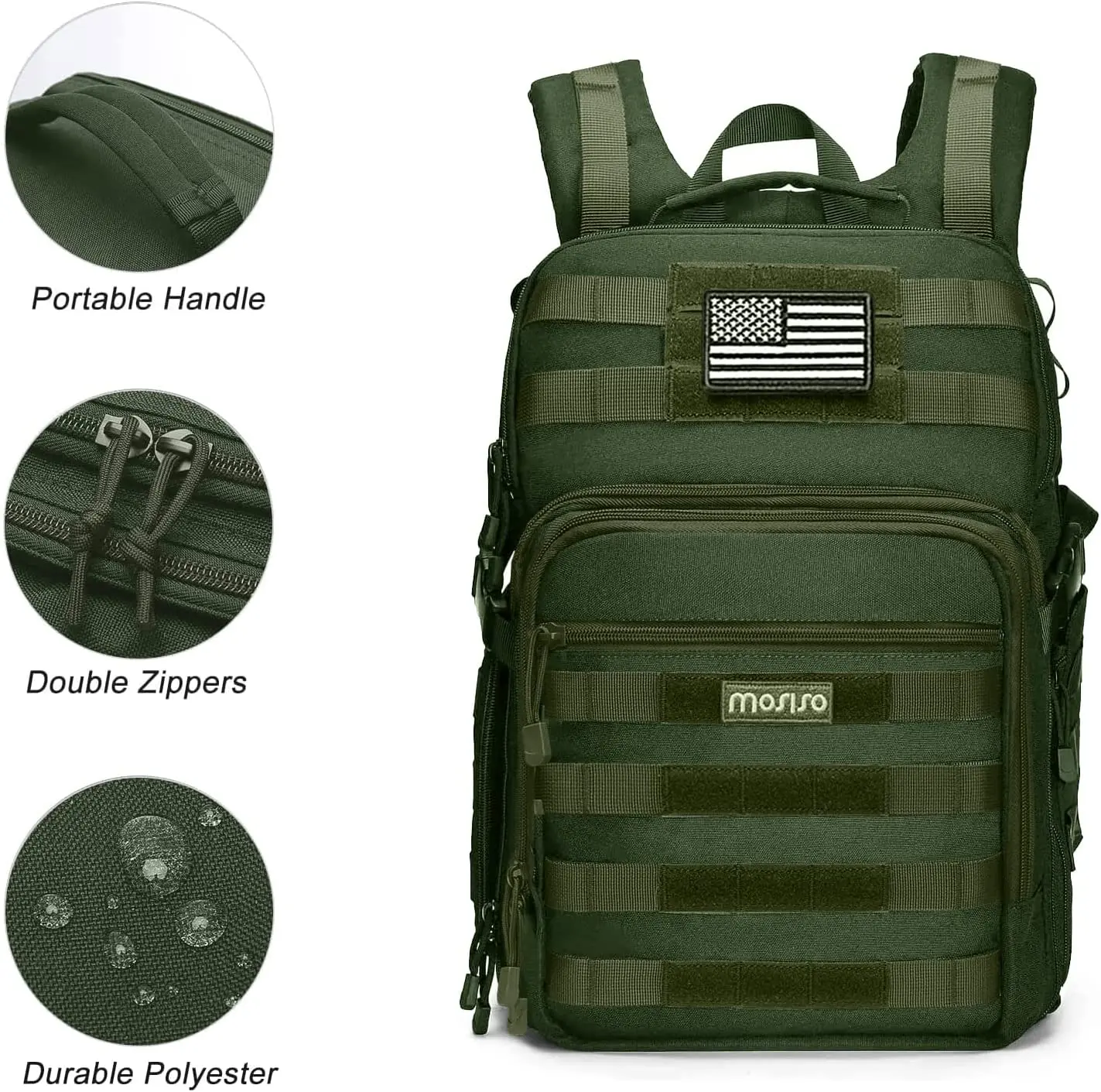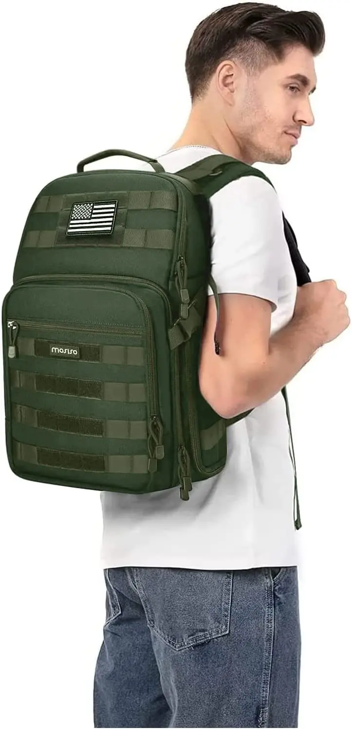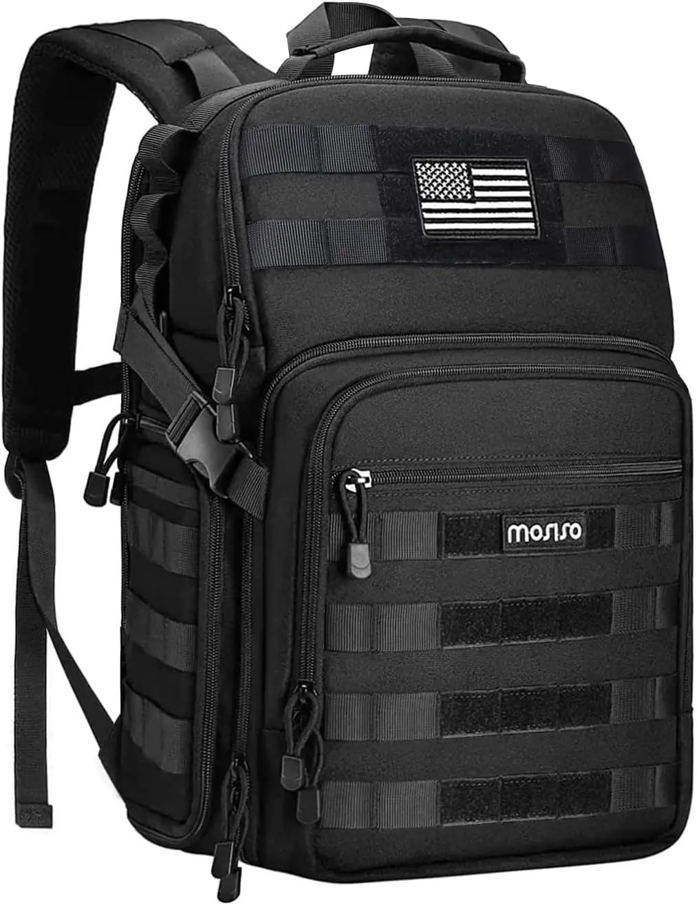 This tactical camera backpack daypack is made of durable polyester material. A removable USA flag patch in front and webbing throughout whole bag can attach additional pouch or outdoor gear. Inner foam padded layer can provide good buffer and protection to your internal stuff against scratches, impact, shock and drops. Reinforcement edge & bottom with side load compression system, perfectly used in wild environment.