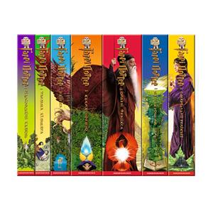 Before the donated set of books about Harry Potter, 7 volumes have gone: from "Harry Potter and the Philosophical Stone" to "Harry Potter and Deadly Relics". Before a set of books, a gift bag with woven handles is added to the end of the side, the corner of the books can be seen.