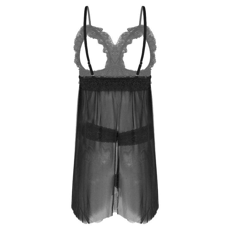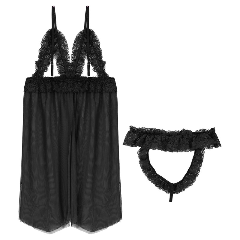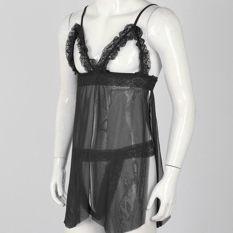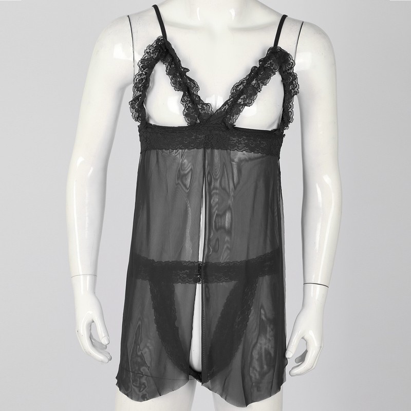 Men Two-piece Lace Trim Lingerie Set Open Front Split See-through Mesh Nightdress with T-back.