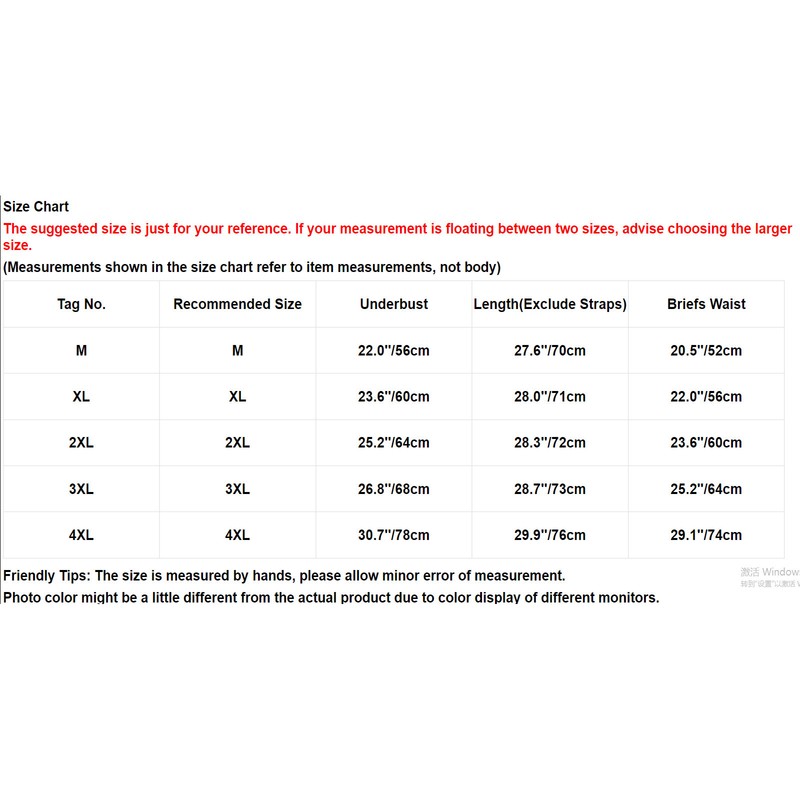 | Tag No. | Recommended Size | Underbust | Length(Exclude Straps) | Briefs Waist |