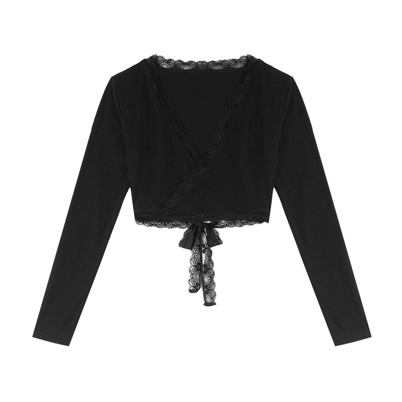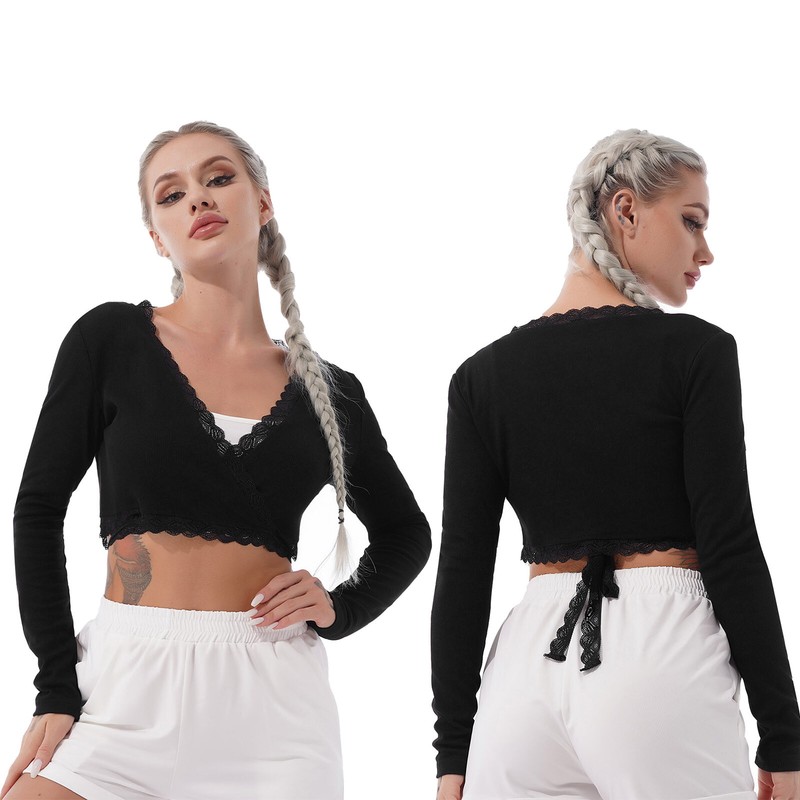 Woman V Neck Long Sleeve Lace-up Crop Top Fashion Lace Trim Ribbed T-Shirt.
