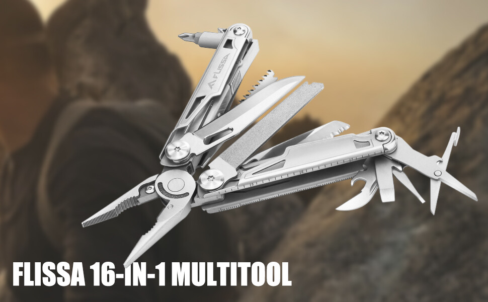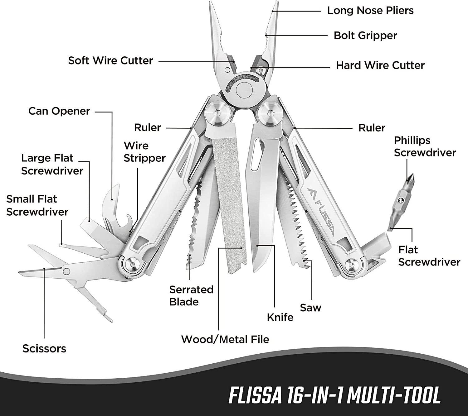 FLISSA Multitool, 16-in-1 Multitools with Sheath, Stainless Steel EDC Multitool, Pocket Knife, Bottle Opener, Screwdriver, Pocket Multi-Tool for Camping, Handwork, Hunting, Hiking, Fishing