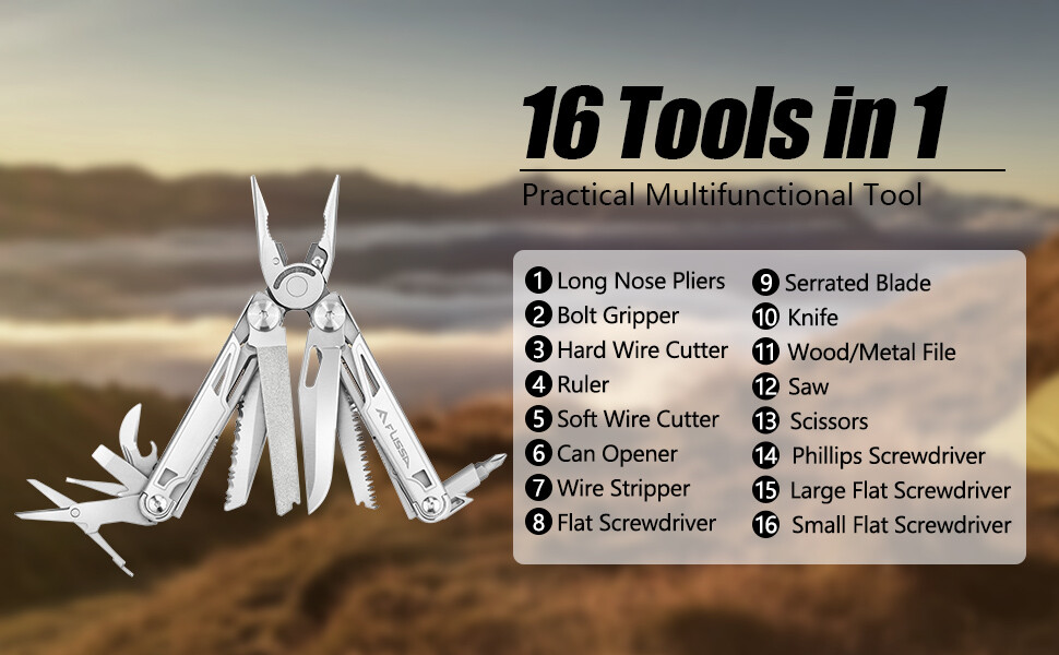 👍16-in-1 Multitool: Foldable 16-in-1 multi-tool Includes--Long Nose Pliers, Bolt Gripper, Hard Wire Cutter, Ruler, Phillips Screwdriver, Flat Screwdriver, Knife, Saw, Serrated Blade, Wood/Metal File, Scissors, Large Flat Screwdriver, Small Flat Screwdriver, Can opener, Wire Stripper, Soft Wire Cutter