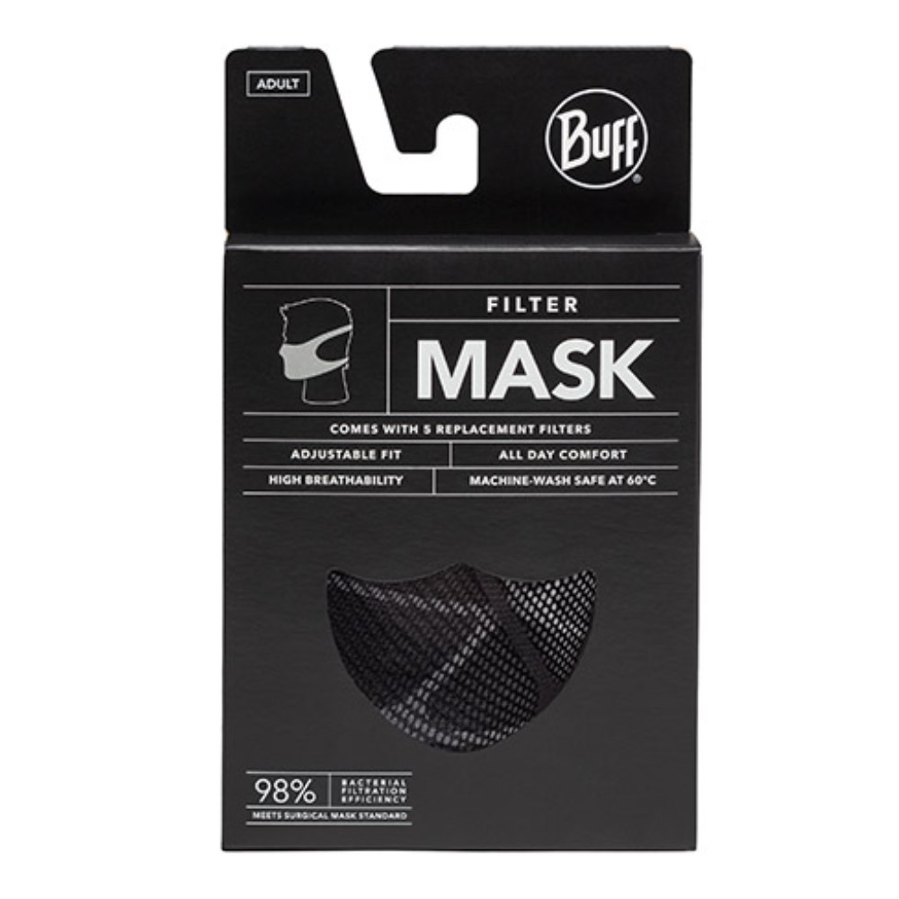 DetailsBBS PART# 8315-Apex-Black Face masks have become an essential accessory for an active daily life. Designed for use with easy change BUFF Replacement Filters (replacements sold separately) that block 98% of airborne particulates and back-of-head adjustable elastic bands that eliminate discomfort behind the ears the BUFF Filter Mask improves active fit and function. Technically built with 4-Way ULTRA STRETCH CoolNet UV+ fabric. Includes (1) Buff Filter Mask and (5) single-use filters. Replacement filters are available in 30-pack boxes and are sold separately.
