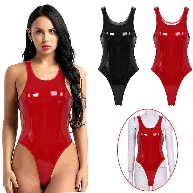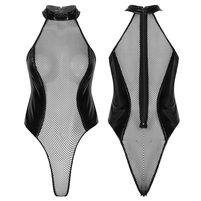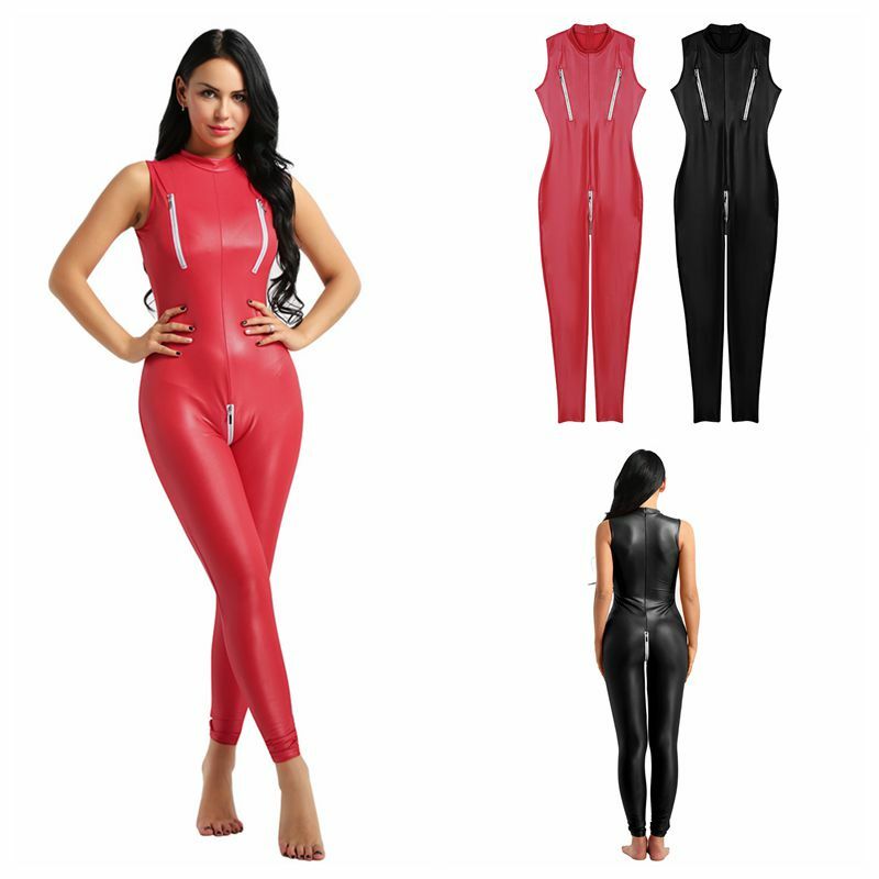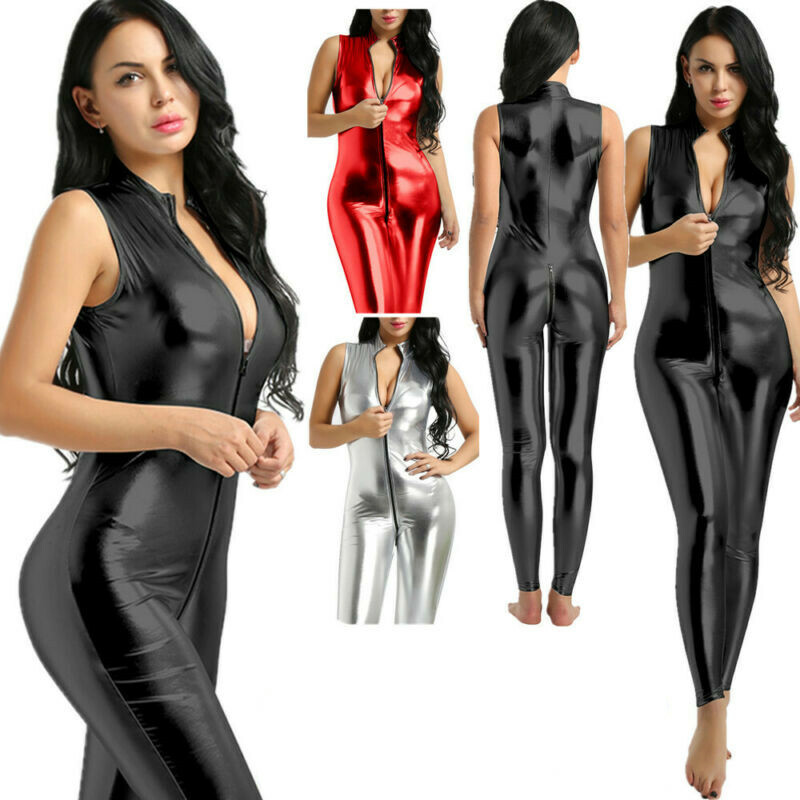 Sleeveless bodysuit for women, glossy surface, mock neck with zipper closure.