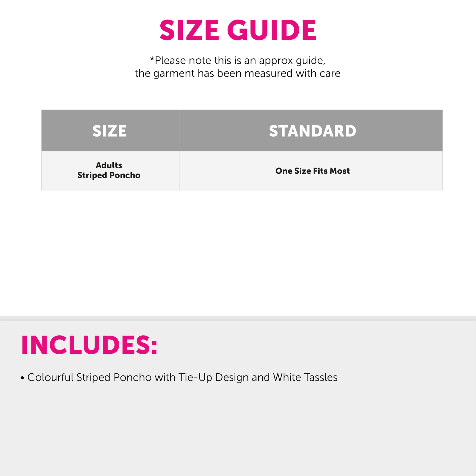 ONE SIZE FITS ALL ADULTS: Your Adults Multi Coloured Poncho is available in only one size, but with its comfortable room and space, your Multi Coloured Poncho will fit any size from Small to XXX-Large!