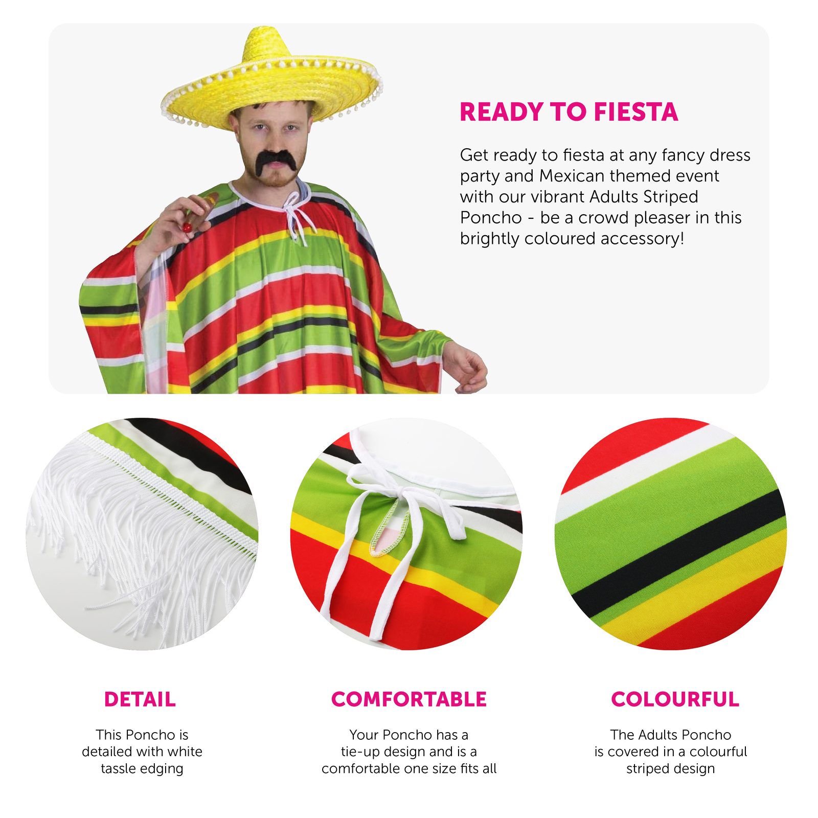 COMPLETE ANY MEXICAN OR COWBOY LOOK: Whether you have a Mexican Sombrero with Maracas or moustache ready, or a Cowboy Hat and costume prepped, complete your look with our Adults Multi-Coloured Striped Poncho!