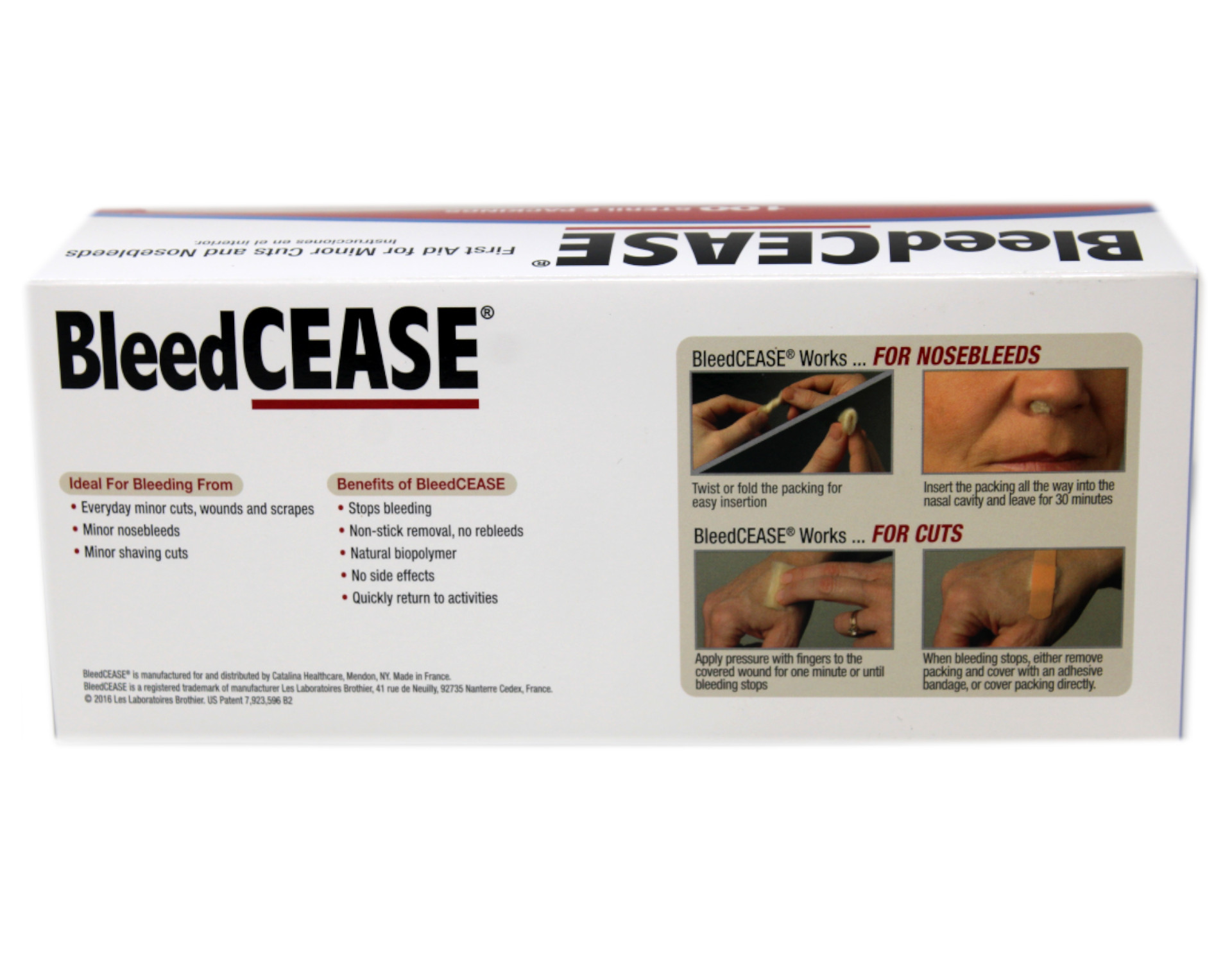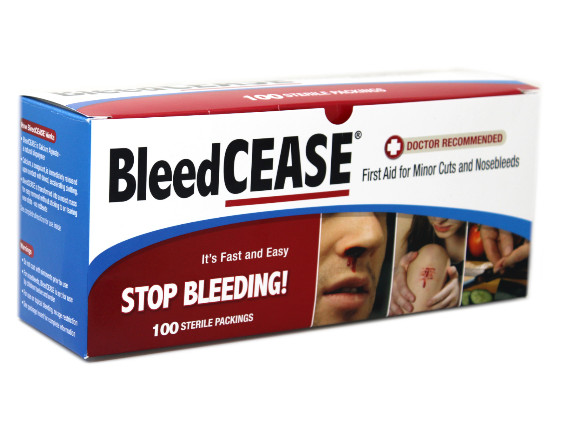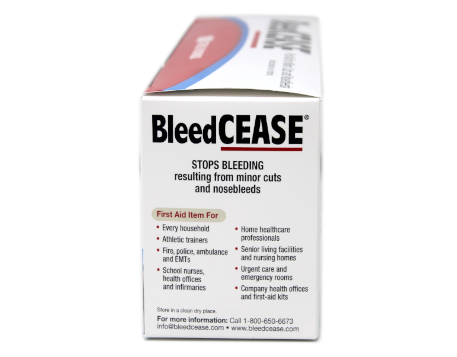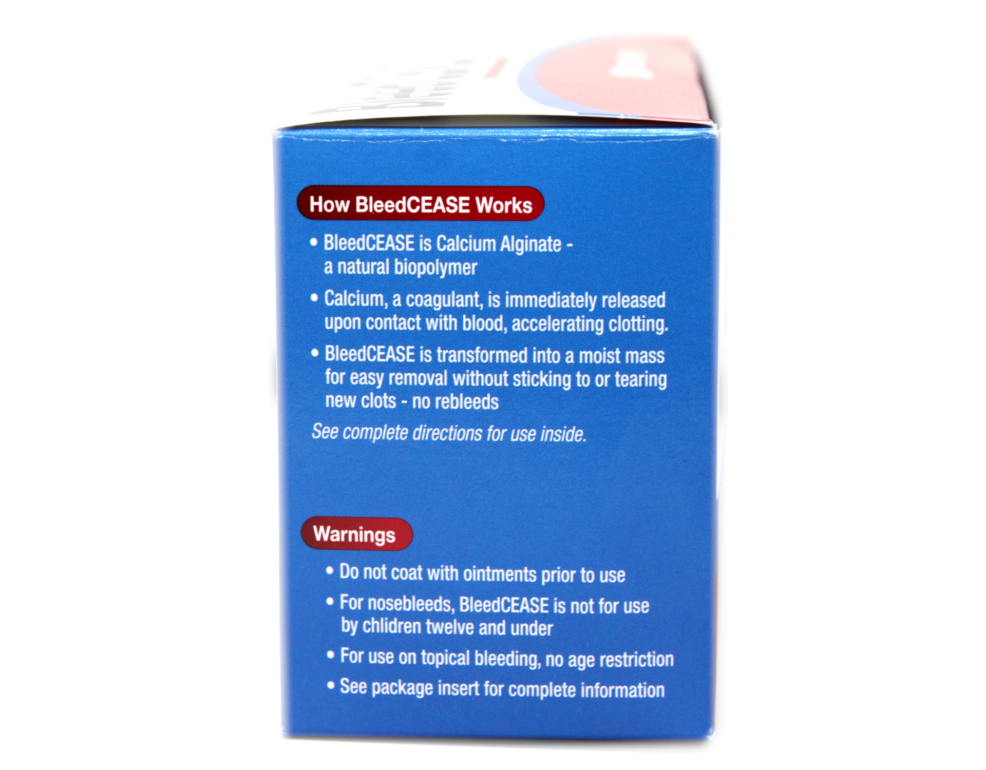 How BleedCEASE Works: BleedCEASE is Calcium Alginate, a natural biopolymer. Calcium, a coagulant, is immediately released upon contact with blood, accelerating clotting. BleedCEASE is transformed into a moist mass for easy removal without sticking to or tearing new clots - no rebleeds. Ideal For Bleeding From: Everyday minor cuts, wounds and scrapes, minor nosebleeds, and minor shaving cuts. Benefits of BleedCEASE: Stops bleeding, non-stick removal, no rebleeds, natural biopolymer, no side effects.