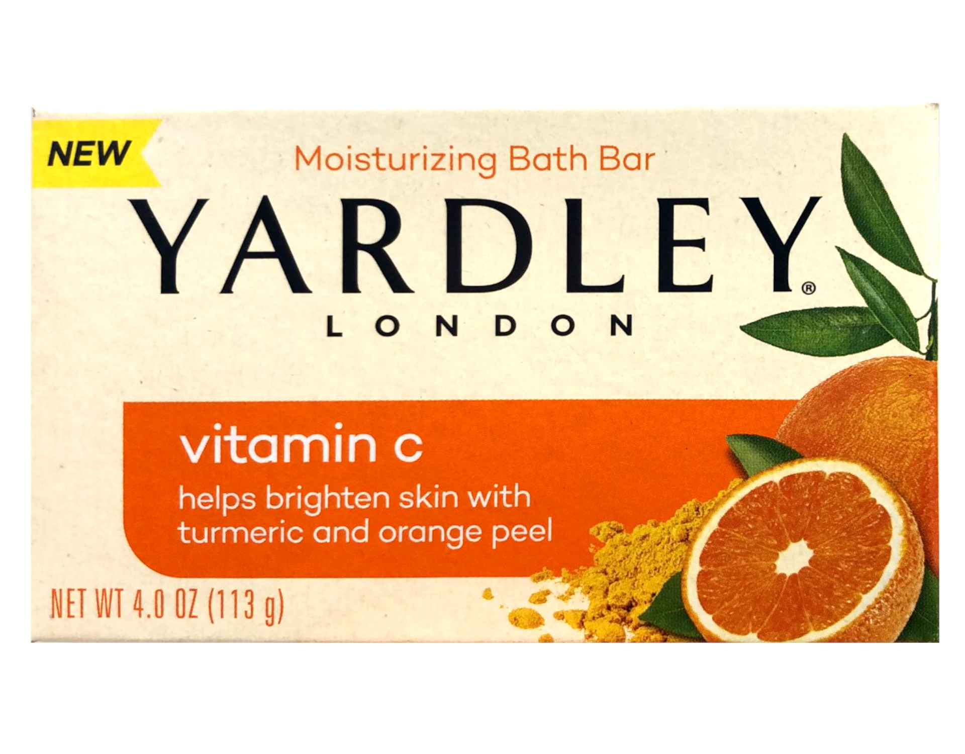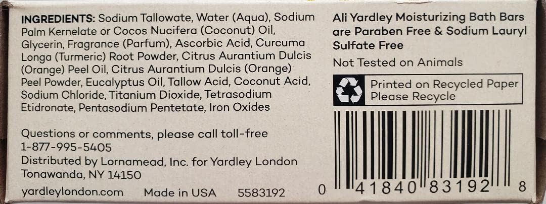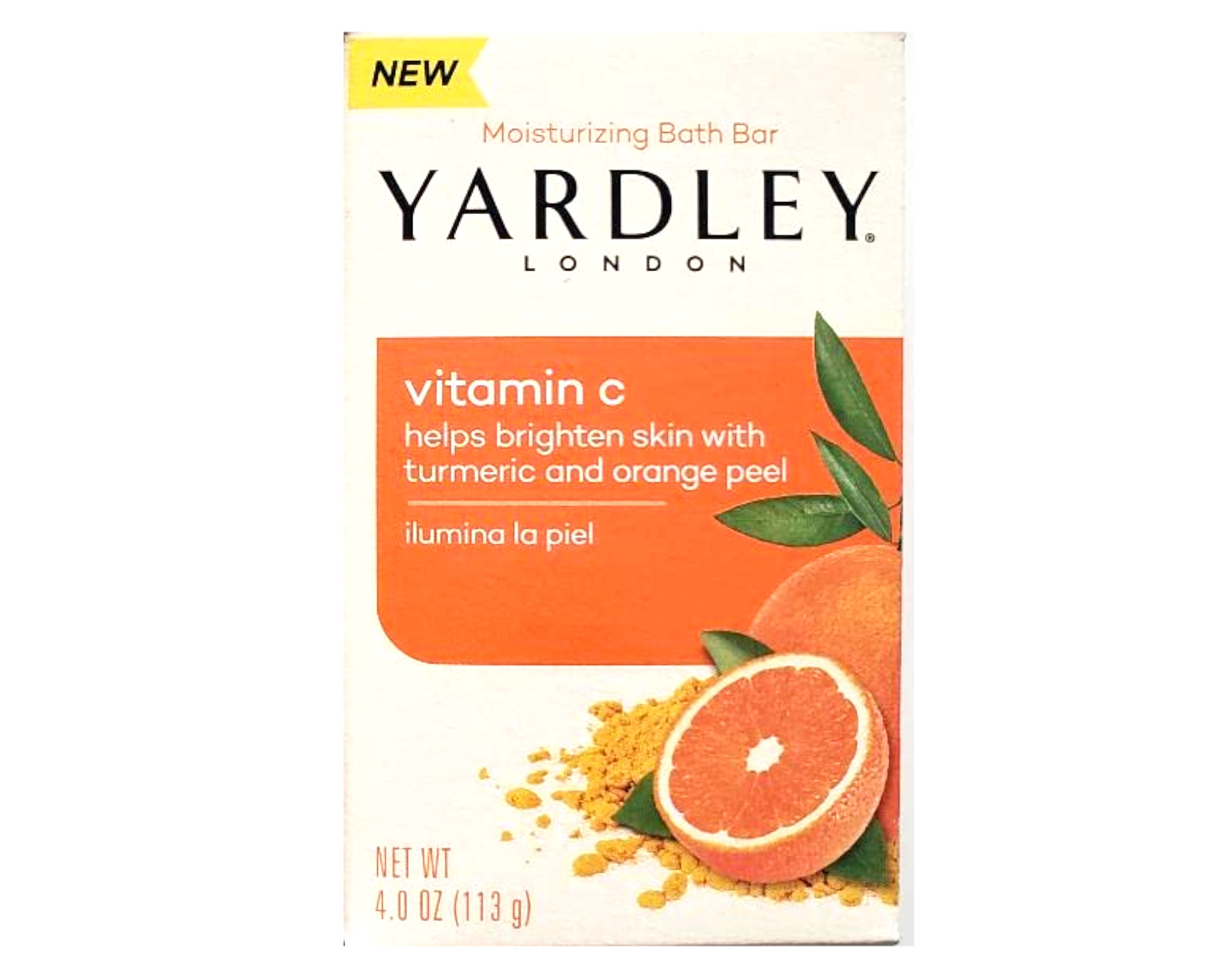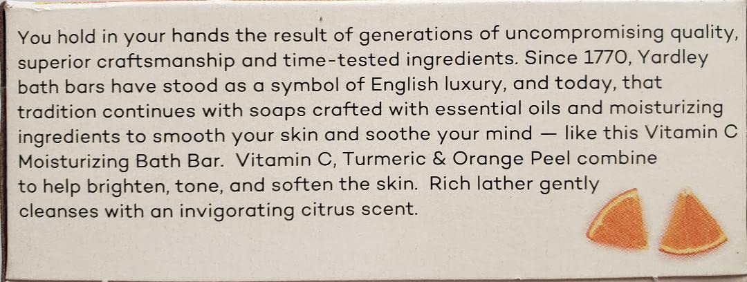 Vitamin C, Turmeric & Orange Peel combine to help brighten, tone, and soften the skin. Rich lather gently cleanses with an invigorating citrus scent. All Yardley moisturizing bath bars are paraben free & sodium layryl sulfate free. Not tested on Animals. Ingredients: sodium tallowate, water, sodium palm kernelate or cocos nucifera (coconut) oil, glycerin, fragrance, ascorbic acid, curcuma longa (turmeric) root powder, citrus aurantium dulcis (orange) peel powder, eucalyptus oil, tallow acid, coconut acid, sodium chloride, titanium dioxide, tetrasodium etidronate, pentasodium pentetate, iron oxides.