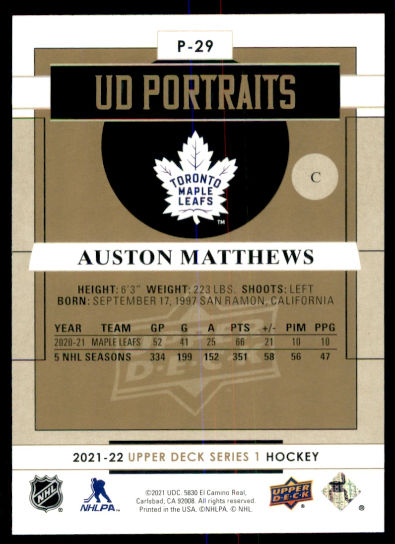 | 2021-22 Upper Deck UD Portraits P-29 Auston Matthews | ||||||||||||||||