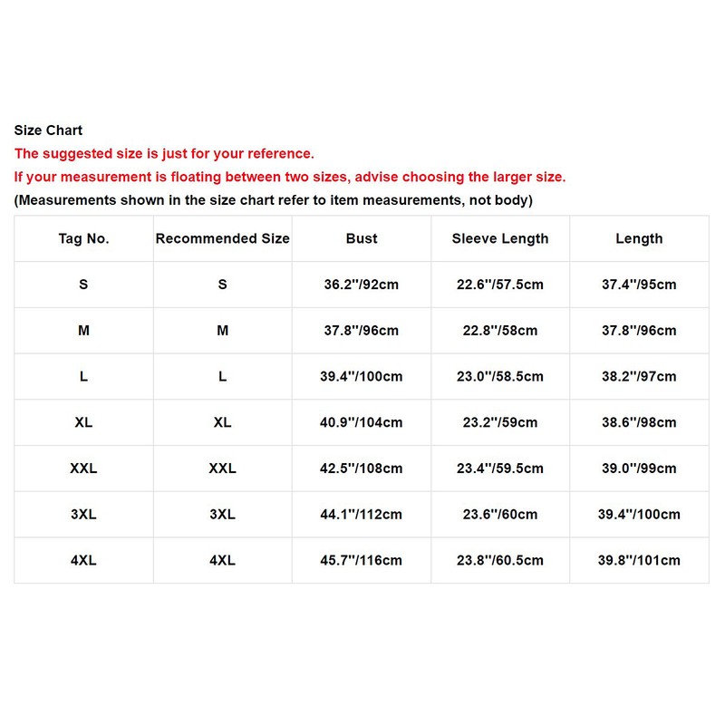 | Tag No. | Recommended Size | Bust | Sleeve Length | Length |