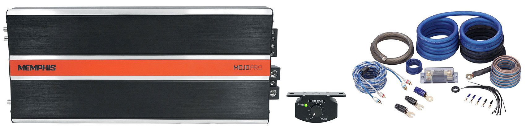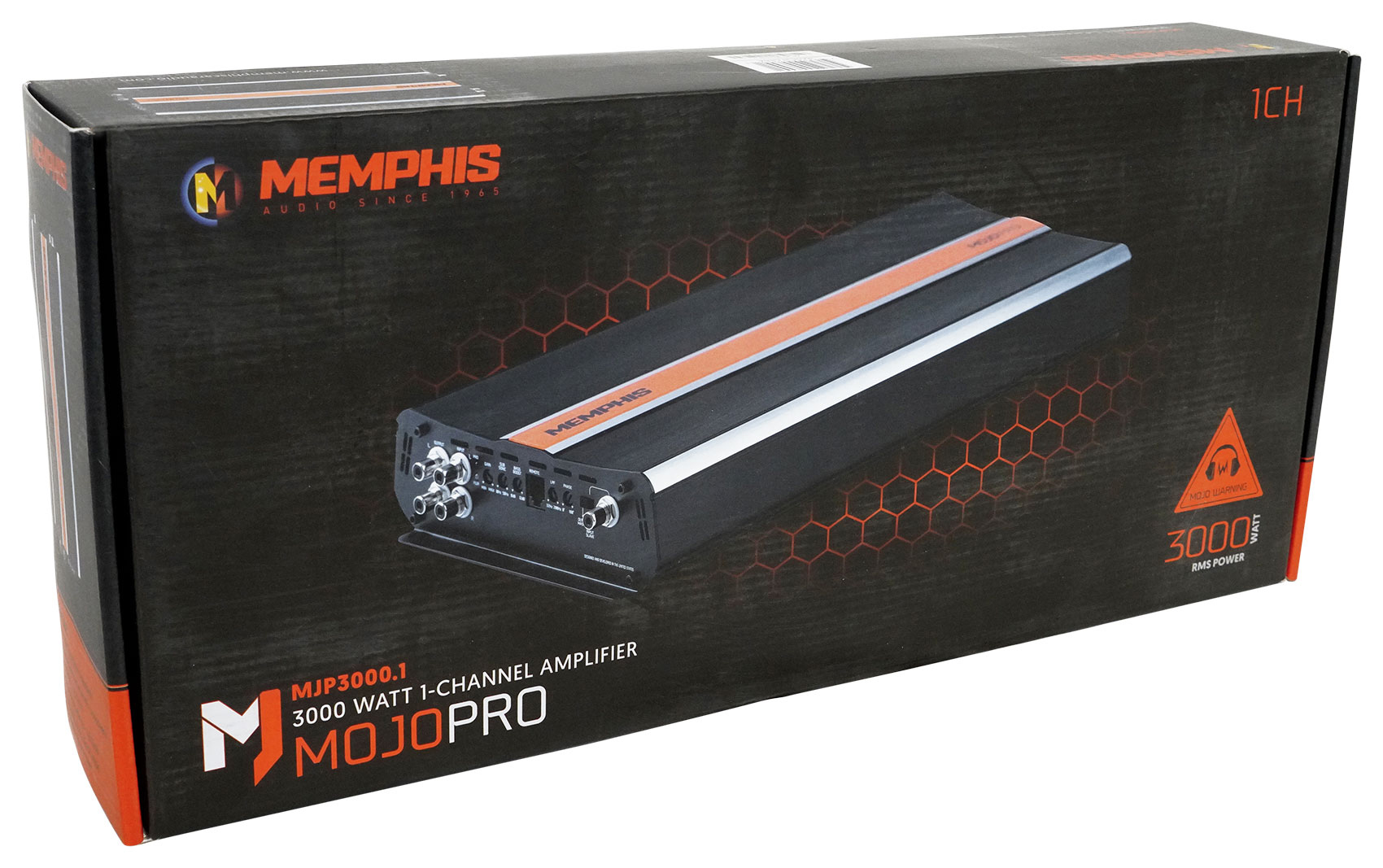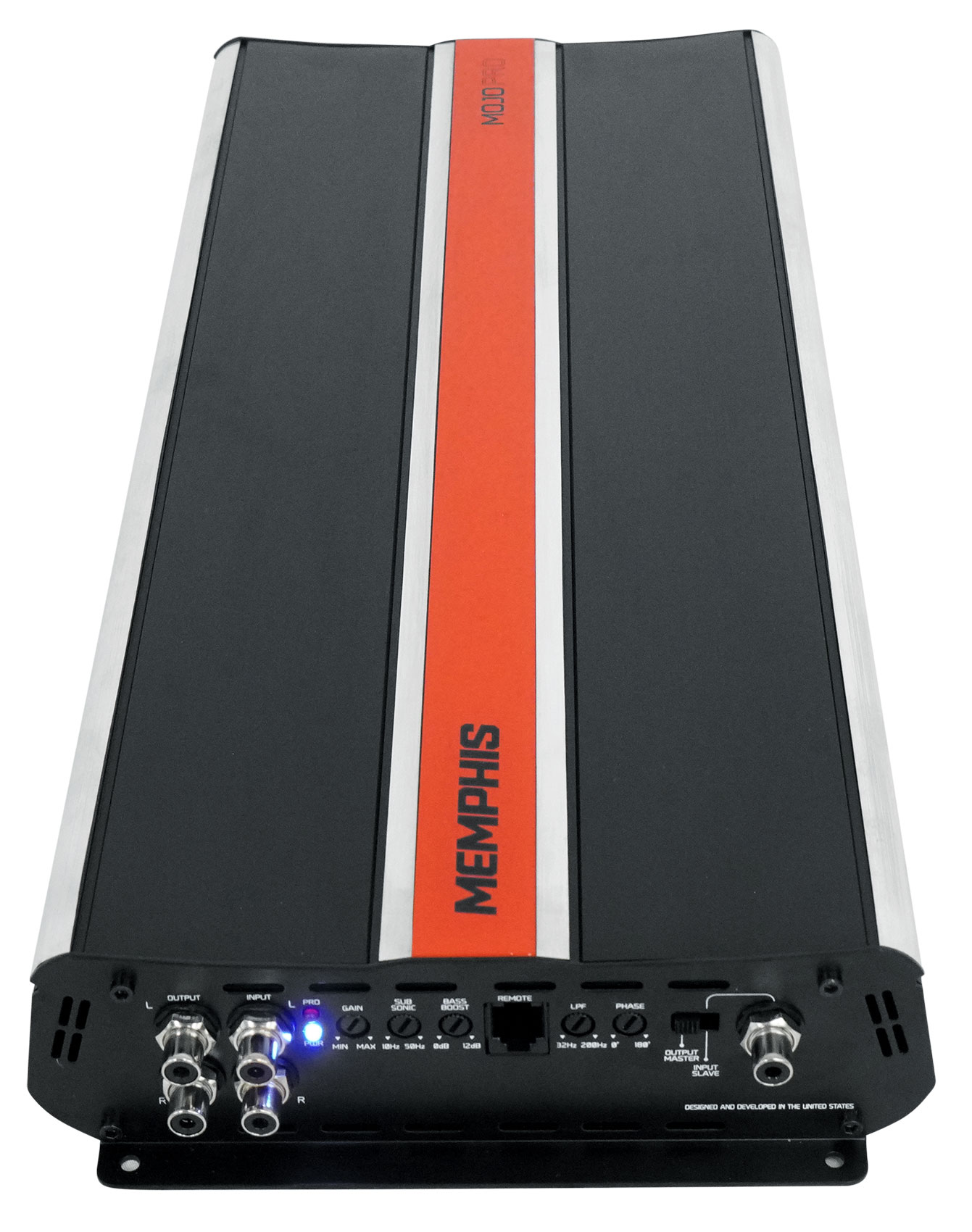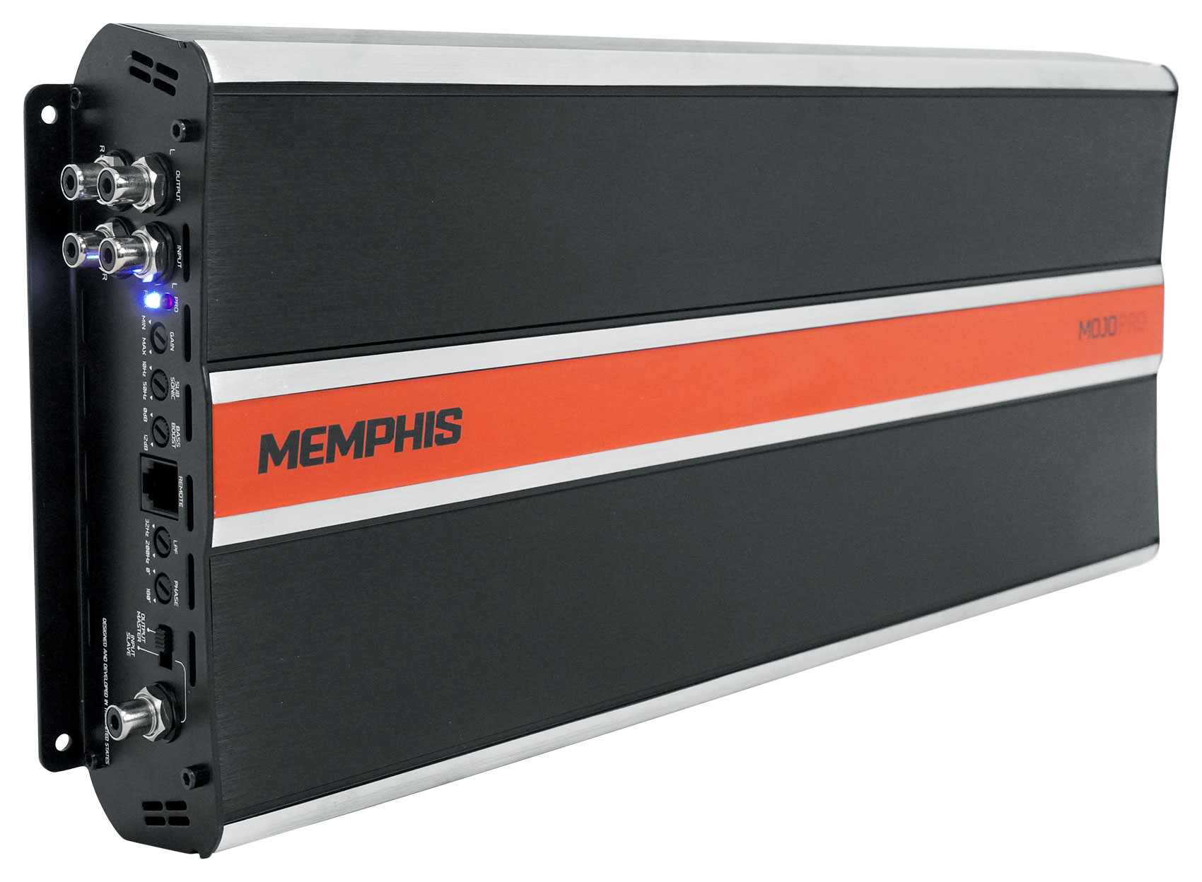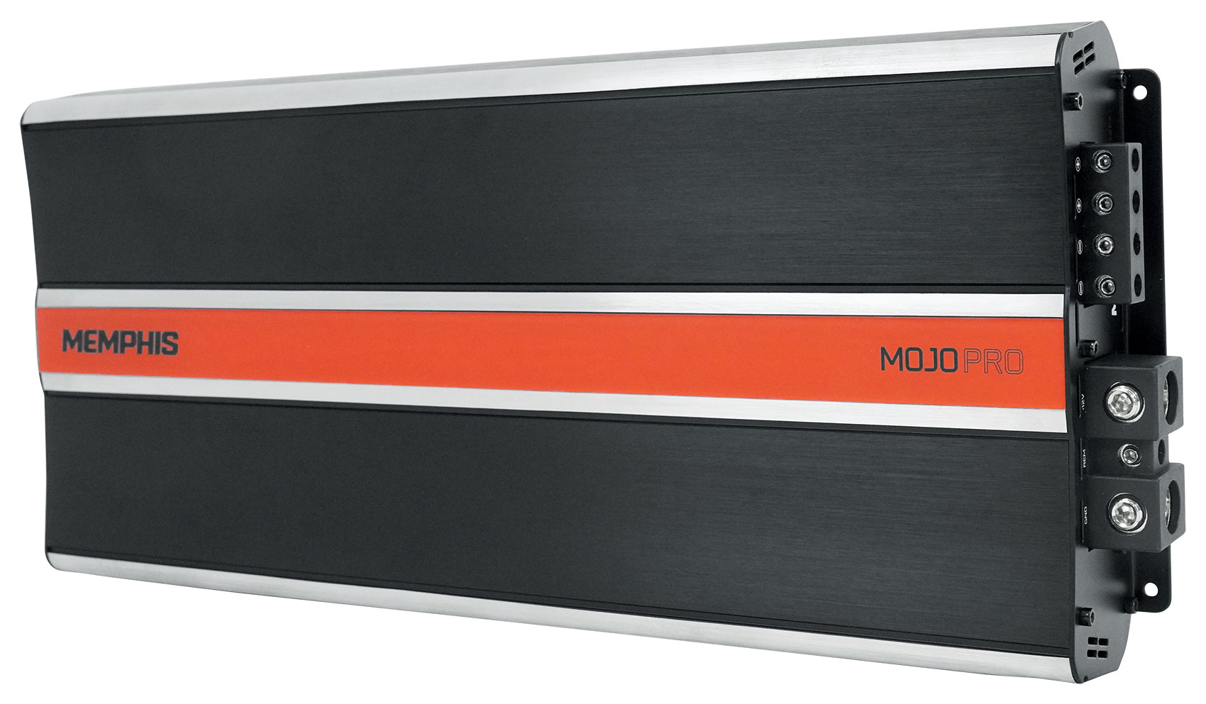 MOJO Pro amplifiers pro audio style amplifiers designed to push massive power to drive any pro audio system to the extreme limits of sound. All MOJO Pro amplifiers are designed with an extruded aluminum chassis with exposed aluminum accents and a vibrant orange accent strip which is befitting of anything bearing the MOJO name. The mono amplifiers are strapable allowing users to combine amplifiers for an experience unlike anything else offered by Memphis.