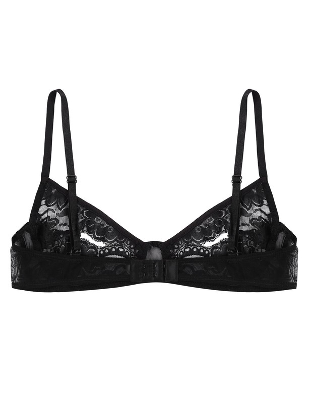 Women’s sheer mesh bralette, unlined triangle cup, stretchy fabric.
