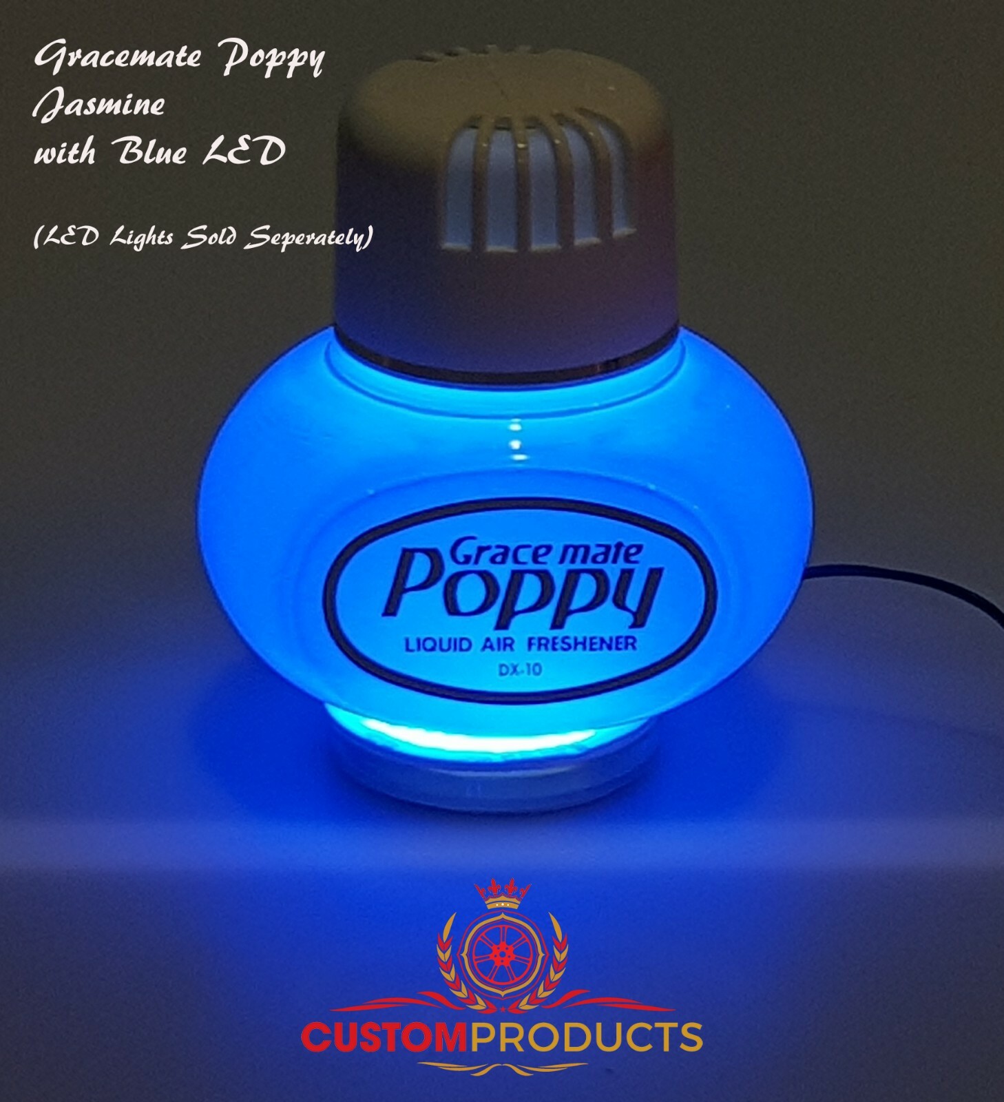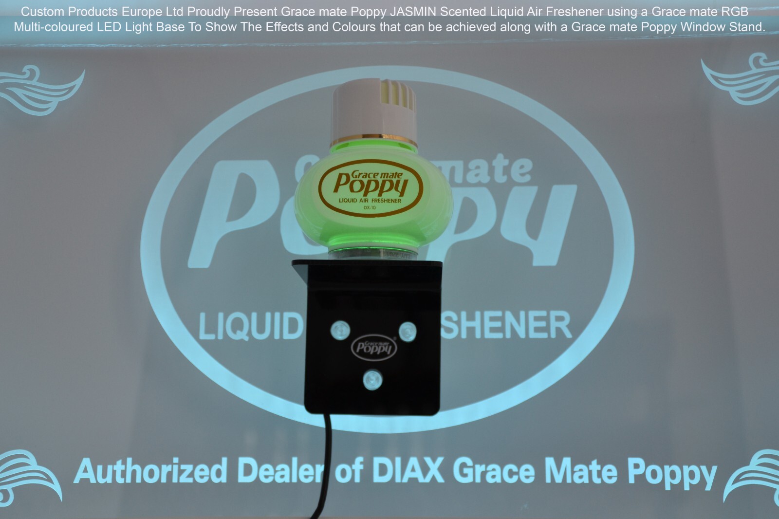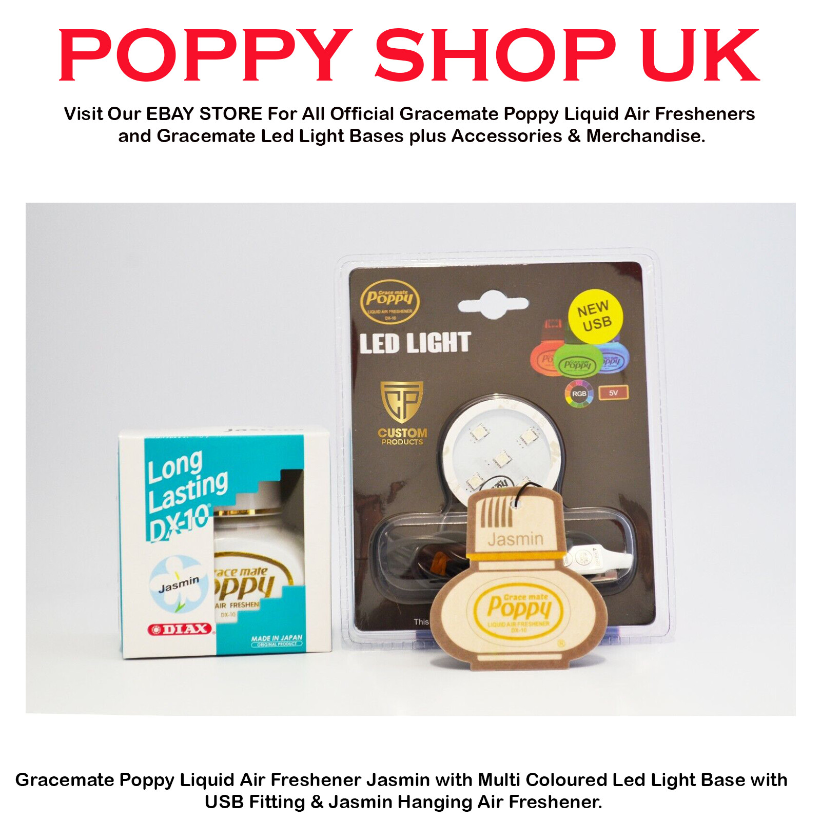 Genuine JASMIN Gracemate Poppy Air freshener with RGB USB Led Light Base with controller to change colours, and set variations including flashing, fading in and out of colours and a JASMIN Hanging Air Freshener. MADE IN JAPAN, pleasant atmosphere in your vehicle or house. The highest grade liquid perfuming agent creates a fresh, pleasant atmosphere in your car, office, home(living room/toilet/bedroom). Specification: Volume: 150ml Dimension: 90X95X95 MM G.W.:350.0 Grams. Eleven scents to choose from. These air fresheners are the Genuine Gracemate Poppy Air Freshener and will last in excess of 3 months in a vehicle. Use provided stickers to place on a flat surface. Gracemate poppy is the world-wide best seller of all Vehicle air fresheners that has more than 30 years history. The Led Bases are supplied with the USB adaptor and are suitable for 5 Volt supply. Simply plug into the USB Port and attach the Poppy Air Freshener to the 3M Sticky pad of the LED Light Base. These Air Fresheners are also suitable for around the home.