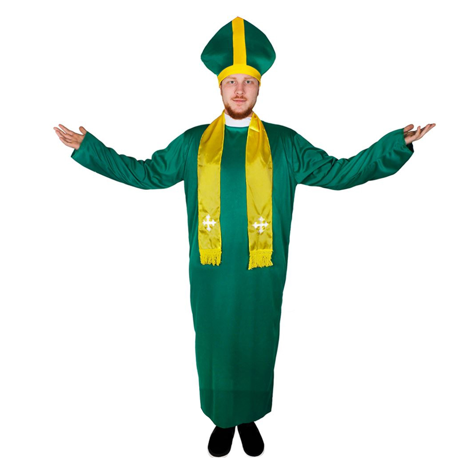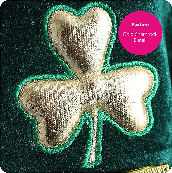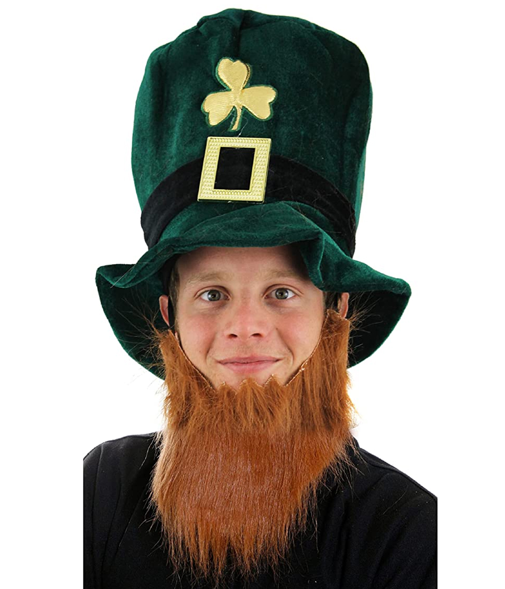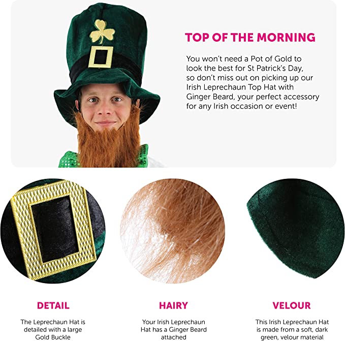 LEPRECHAUN HAT DETAILS: Your Irish Leprechaun Hat is a dark green, soft, velour Top Hat with a Gold Shamrock detail embroidered on the front, a Gold Buckle band and an attached Ginger Beard, a great addition to your Irish outfit!
