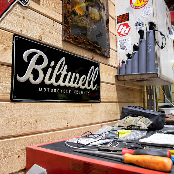 In 50 years one of these made in USA stamped aluminum Biltwell shop signs might sell for 5,000 bucks on season 75 of "American Pickers." Until that day comes, you can buy one for less than the price of two large Costco pizzas. Stamped construction with screenprinted graphics.