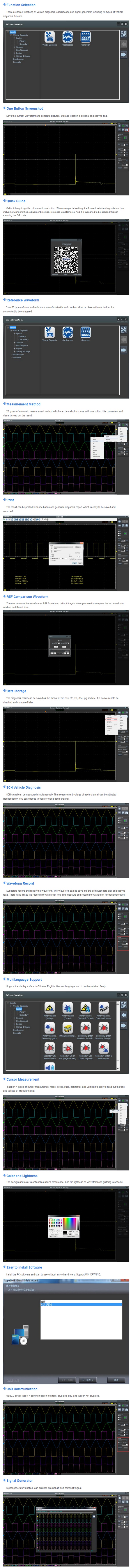 8 channels oscilloscope for vehicle testing. Over 80 types of automotive diagnostic function (Ignition/Sensor/Bus detection/Performe/Starter and charging circuits etc.).