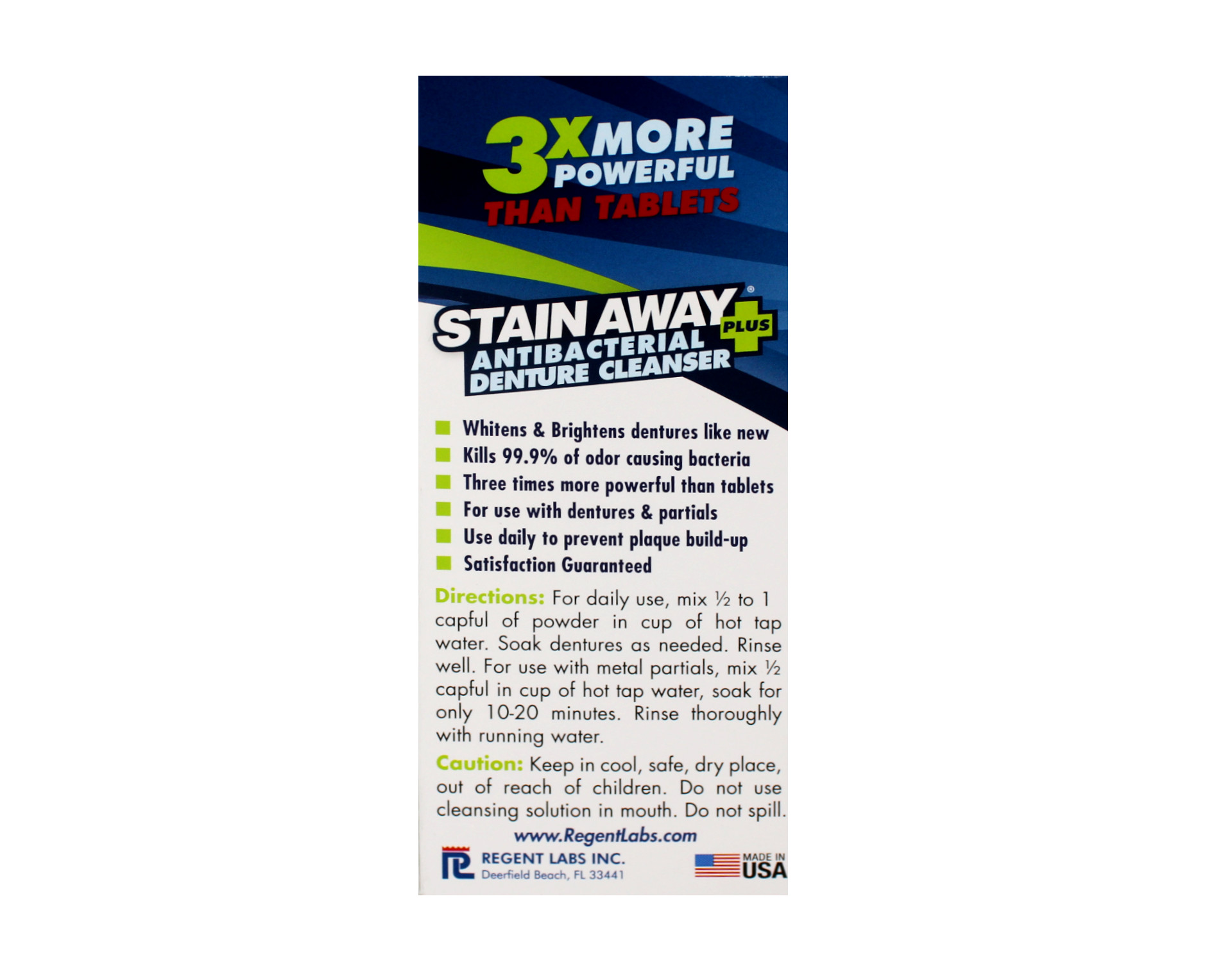 Whitens and brightens dentures like new Daily use prevents plaque build-up Kills odor causing germs 80 Cleanings Fast Action- Cleans in 5 minutes Whitens & Brightens Dentures Like New! Works all night long to give you a professional cleaning every time Clean, minty-fresh taste Kills odor causing germs Whitens & Brightens dentures like new 3x more powerful than tablets Fast acting, powerful effervescent powder recommended for full dentures only Use daily to prevent plaque build up Satisfaction guaranteed Satisfaction guaranteed. For daily use, mix 1/2 to 1 capful of powder in 1/2 cup of hot tap water. Soak dentures. Rinse thoroughly. For heavy stains, mix 2-3 capfuls in 1/2 cup of hot tap water. Soak for 20-30 minutes or overnight as needed. Rinse. Regent Labs, Inc