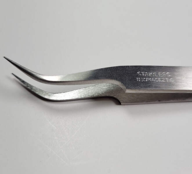 Extra fine curved tweezers, ideal for reaching into awkward areas, picking, holding and placing very small parts and components with great accuracy. They are solvent resistant and anti-magnetic.