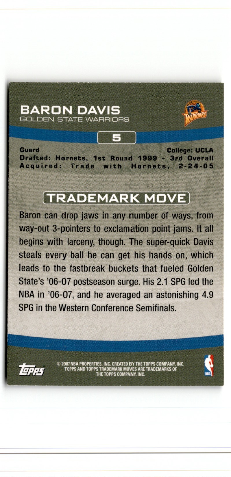 | Description: | Baron Davis | | Category: | Basketball | | Year: | 2007 | | Product: | Topps Trademark Moves | | Team: | Golden State Warriors | | Card Number: | 5 | | Dimensions: | 3½" x 2½" |