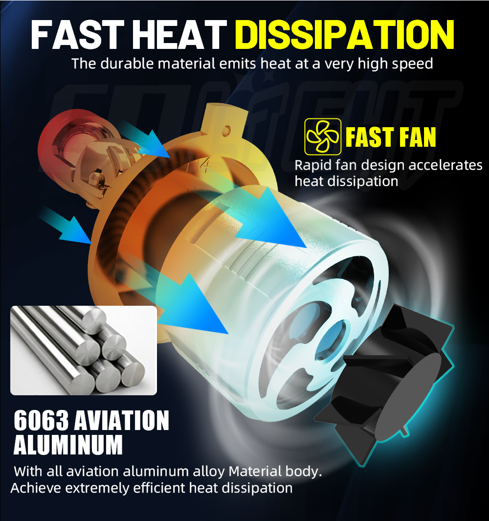 4. Aviation Aluminum Body and Built-in Fan, Fast Heat Dissipation.