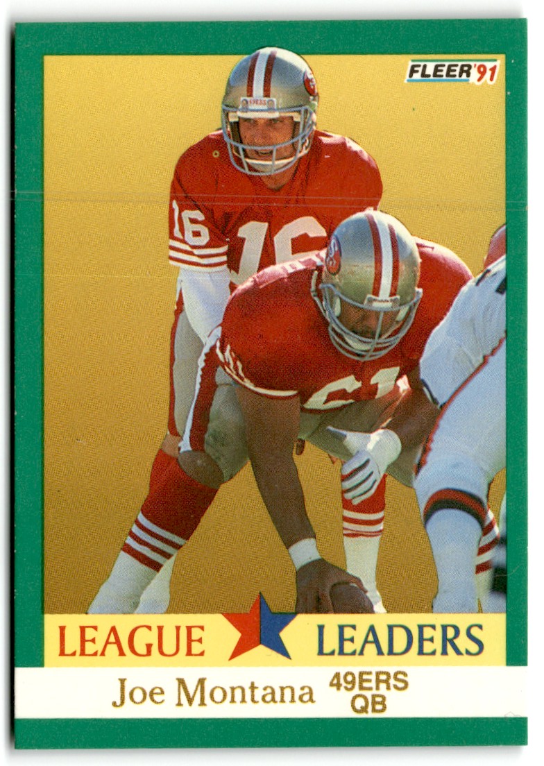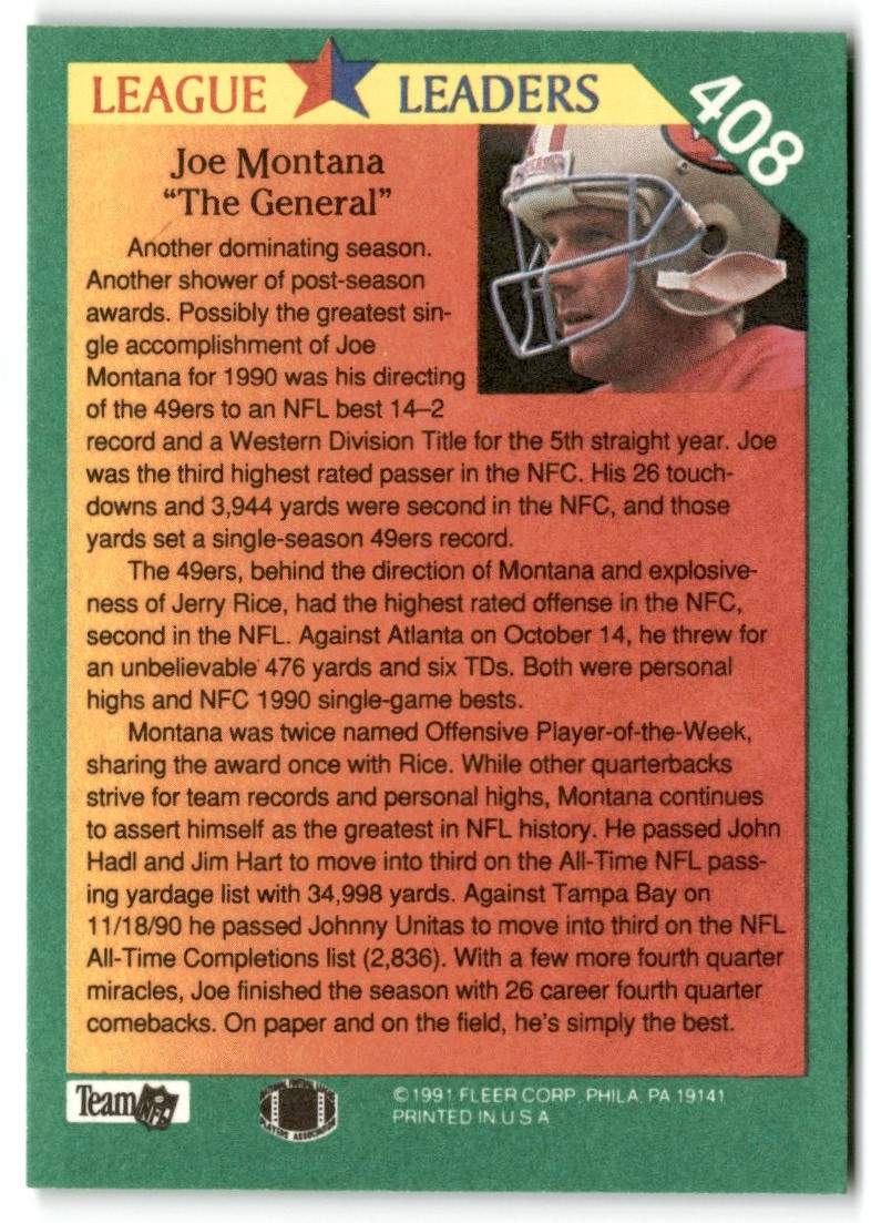 | Description: | Joe Montana | | Category: | Football | | Year: | 1991 | | Product: | Fleer | | Team: | San Francisco 49ers | | Card Number: | 408 | | Dimensions: | 3½" x 2½" |